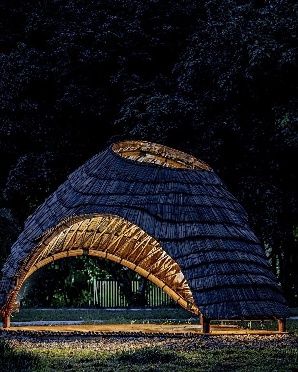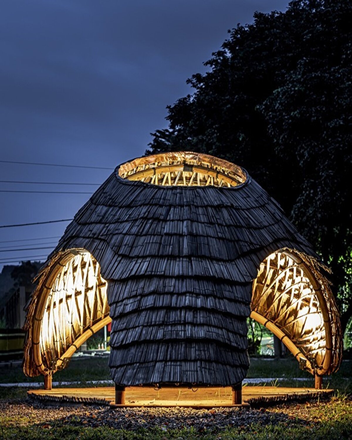 Metalik sertlik ve bambu benzeri esnekliği bir araya getiren yapısal gövde, bambu kiremit kaplı hiperboloid çatı ile entegre ediliyor. Bu tasarımın yanı sıra diğer özenle seçilmiş mimari detaylar, sürdürülebilir, çevre dostu bir bambu yapısı ortaya çıkarıyor.