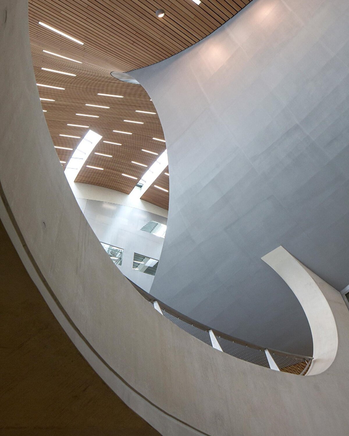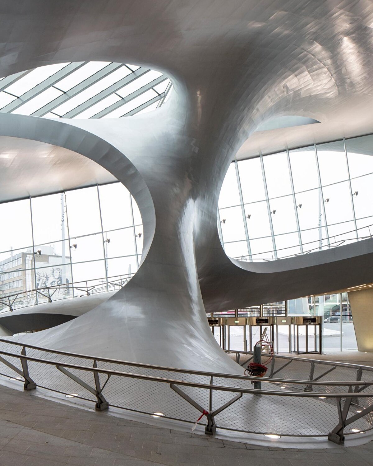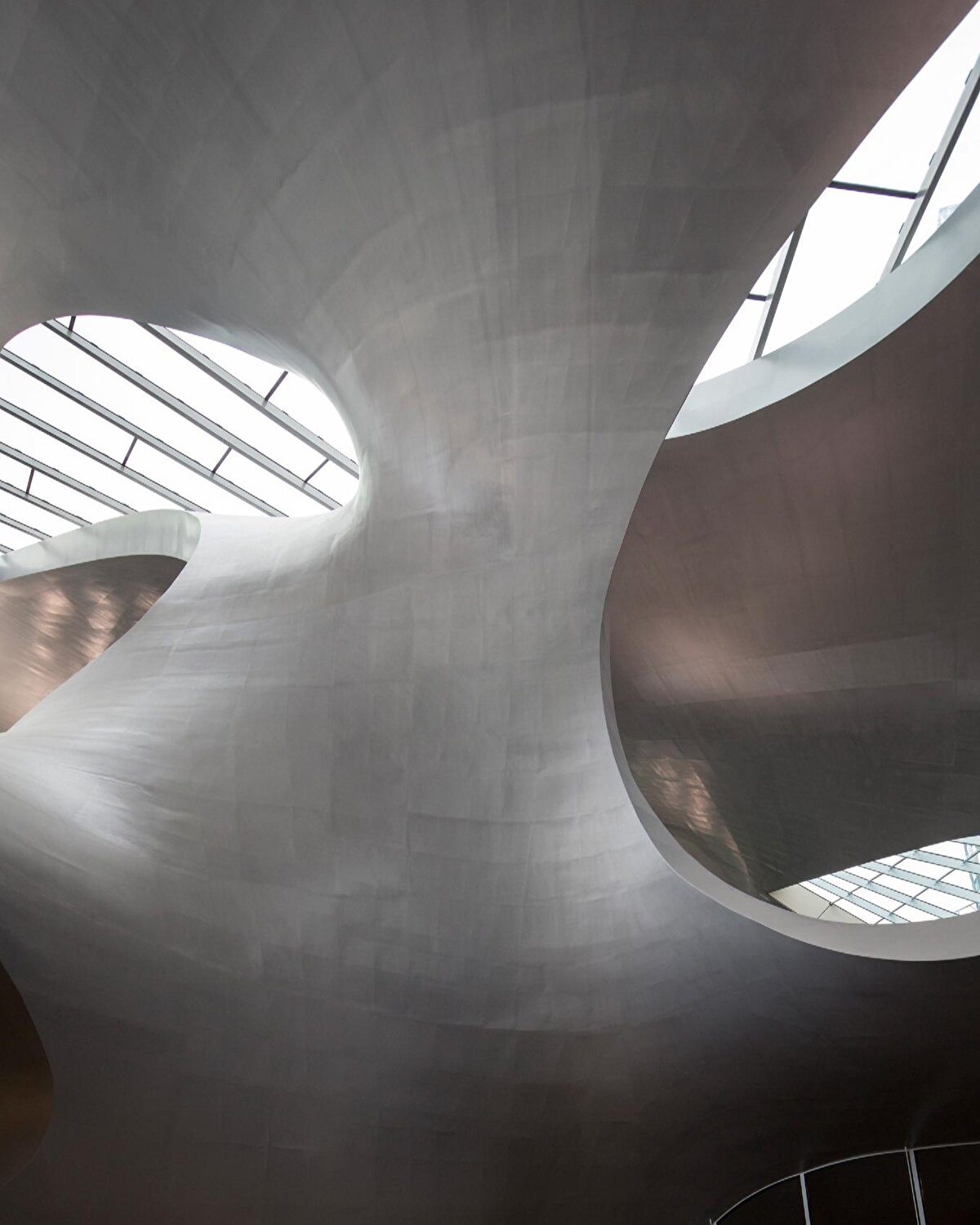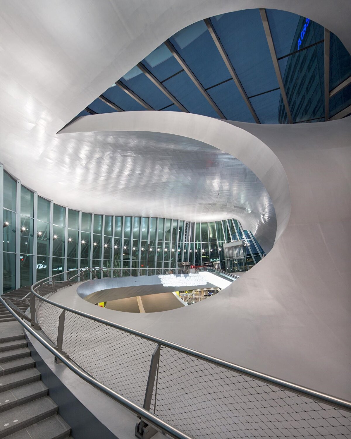 Tasarımsal olarak en dikkat çeken öge “twist" ya da “burgu" denilen merkez kolon ve onun çatıyı destekleyiş biçimi oluyor. Bu yapı, devasa açıklıkları (60 m'ye kadar) kolon kullanmadan elde etmeyi sağlıyor ve bu mekânın ferahlığını, ışık ve atmosfer kullanımını etkileyen önemli bir unsur oluyor. Ancak bu “büyük form" hamlesi beraberinde karmaşıklık, maliyet riskleri, yapım tekniği ve malzeme seçimi gibi ciddi sorunlar da getiriyor. Mesela, proje başında betonla yapılması planlanan yapı, daha hafif çelik elemanlara yöneliyor.