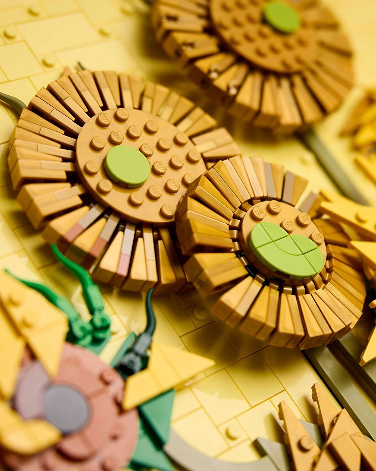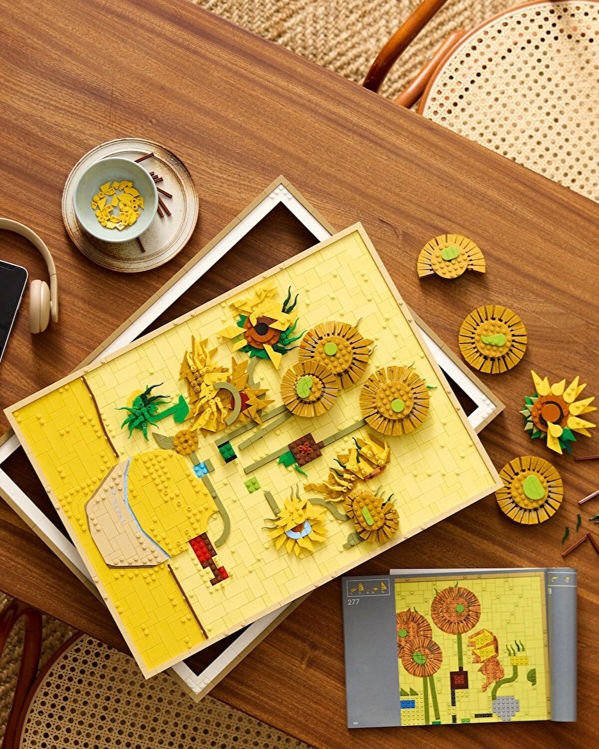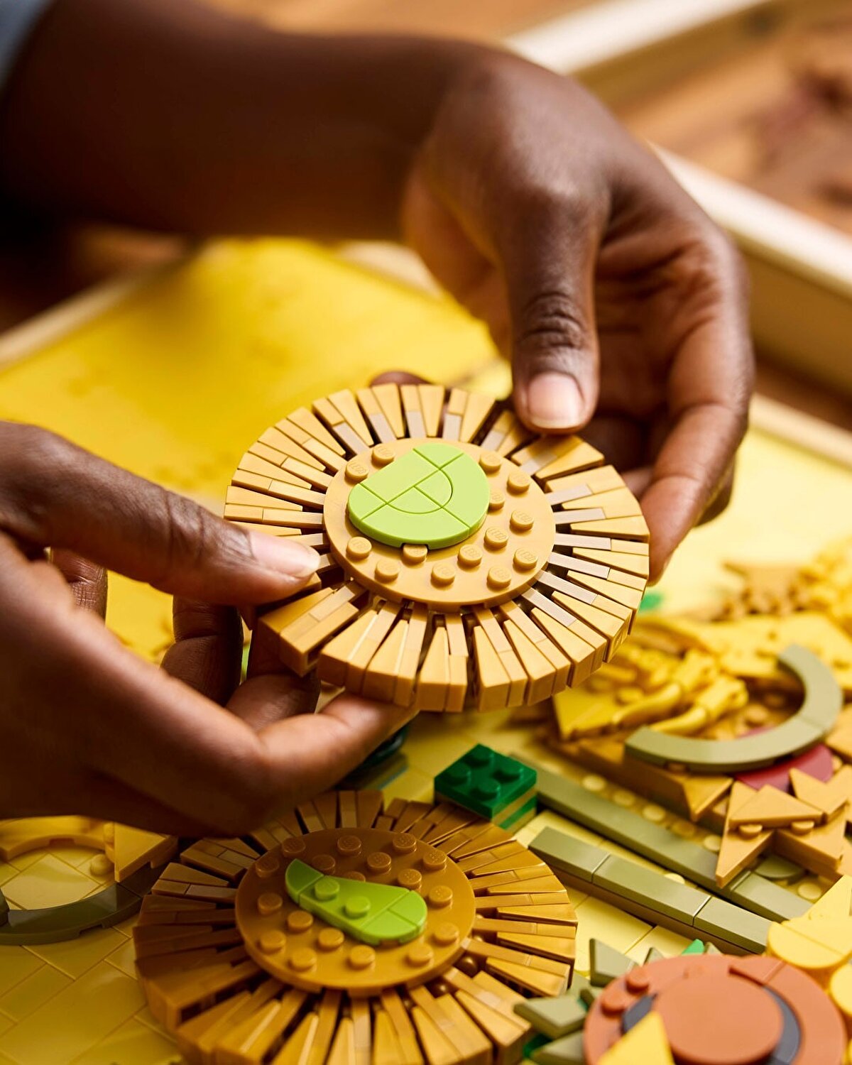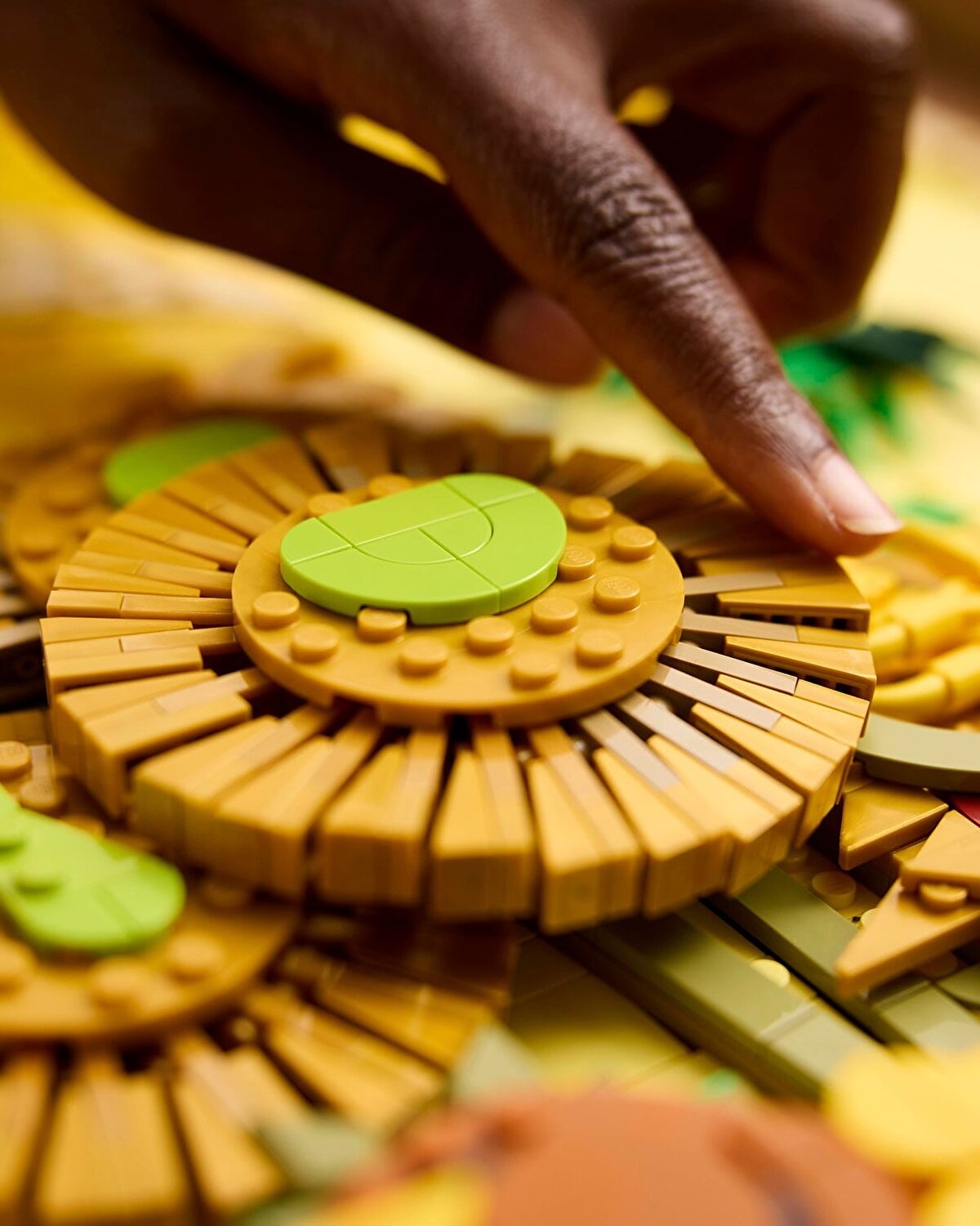 Set, ayarlanabilir yapraklarıyla 16 ayçiçeği, çıkarılabilir bir çerçeve ve sanatçının imzasını taşıyan özel bir karodan oluşuyor. Çerçevede yer alan ahşap şerit detayı ise Van Gogh'un tablosuna yaptığı yapısal ayarlamaları yansıtıyor. 2.615 parçadan oluşan bu özel set, Van Gogh'un canlı sarı tonlarını ve karakteristik kalın boya darbelerini (impasto) LEGO parçalarıyla yeniden canlandırıyor.