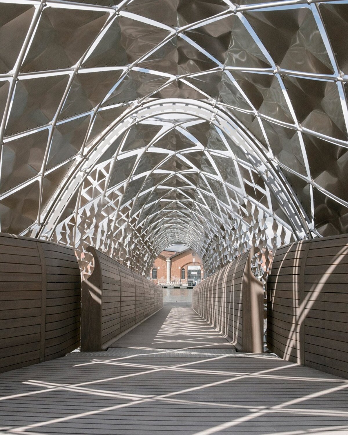 Taşıyıcı sistemi, Porsche'nin yarış araçlarında kullanılan hafif alüminyum teknolojilerinden esinlenerek geliştiriliyor. Biyomorfik form ve kinetik yüzeyiyle yapı, hem dinamik bir mekânsal kurgu sunuyor hem de Venedik'in tarihsel köprü tipolojilerine referans veriyor. Köprü, yalnızca bir geçiş yapısı değil, aynı zamanda kente su üzerinden giriş yapan kullanıcılar için bir eşik mekânı oluşturuyor.