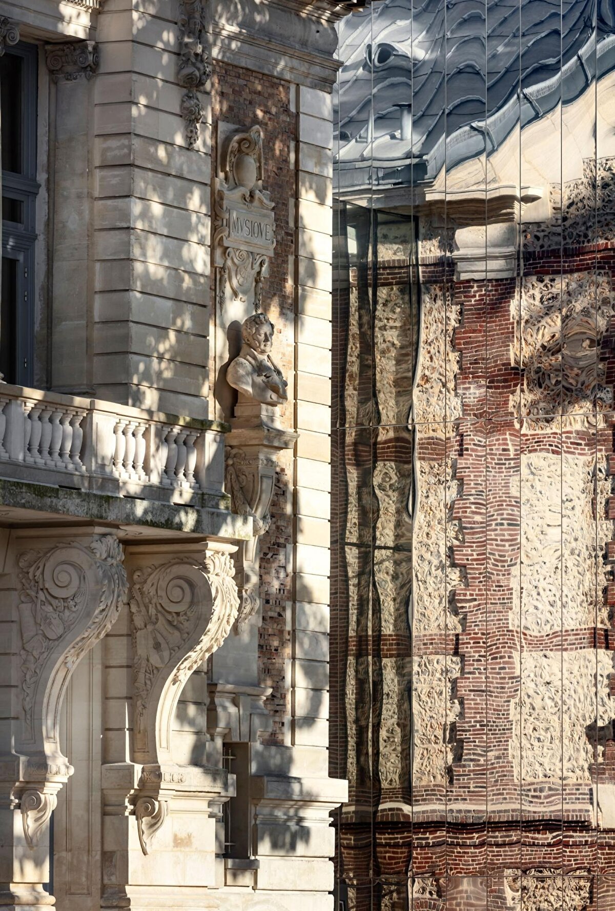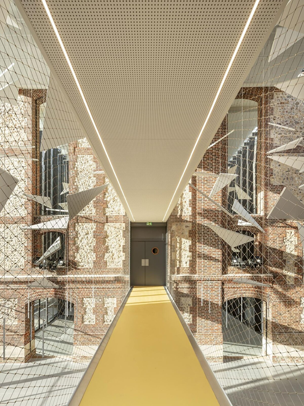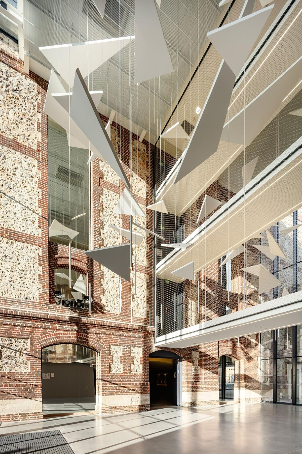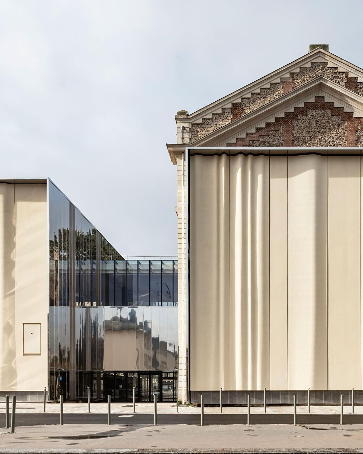 In Évreux, OPUS 5 architectes has repurposed the 1903 Beaux-Arts style Théâtre Legendre. The restoration process has restored the original proportions of the brick and silex cladding while preserving the building's historical identity. The glass lobby located to the south creates a transparent intermediate space between the historic structure and the recessed extension. Three metal bridges directly connect the new extension, which houses rehearsal areas and dressing rooms, to the theatre hall. The spacious volume designed behind the stage allows for the movement of sets and increases the stage depth. The reflective wall surface used in the lobby transfers the existing façade texture to the space, creating a visual continuity between the historical and contemporary elements.