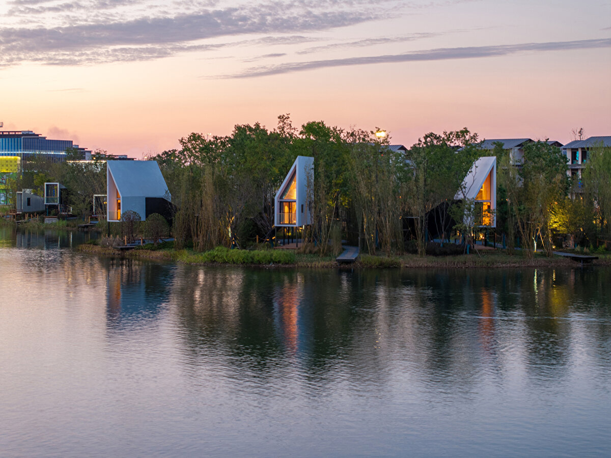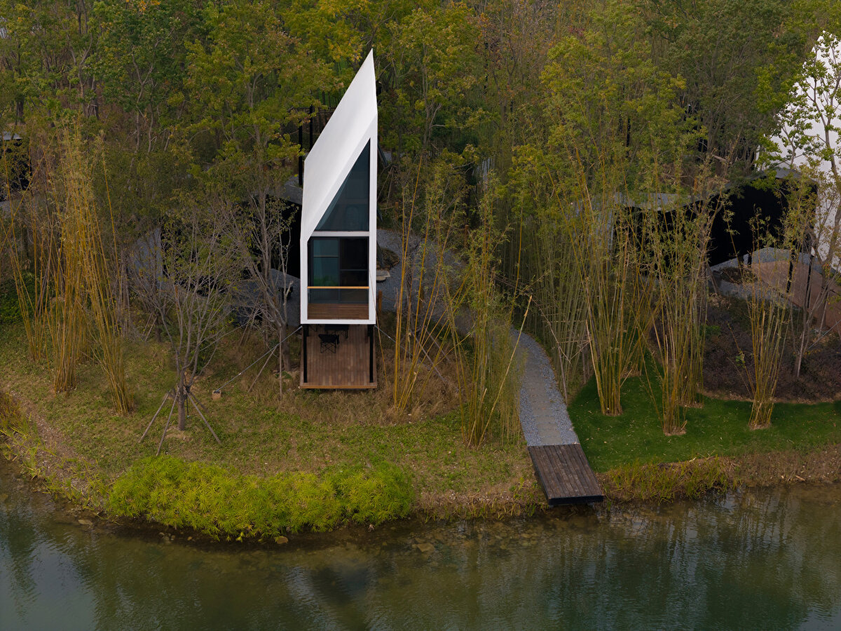 “Yelkenli Kabin" (The Cabin of Sails), 2024 yılında Çin'in Wuhan kentinde hayata geçiriliyor. Advanced Architecture Lab ve Wiki World tarafından tasarlanan yapı, yalnızca iki metre genişliğinde, dar ve uzun formuyla minimum düzeyde fiziksel iz bırakacak şekilde kurgulanıyor. Her biri kendine ait küçük bir iskeleye sahip üç bağımsız kulübeden oluşan yapı grubu, yalnızca tekneyle erişilebilecek şekilde planlanıyor.