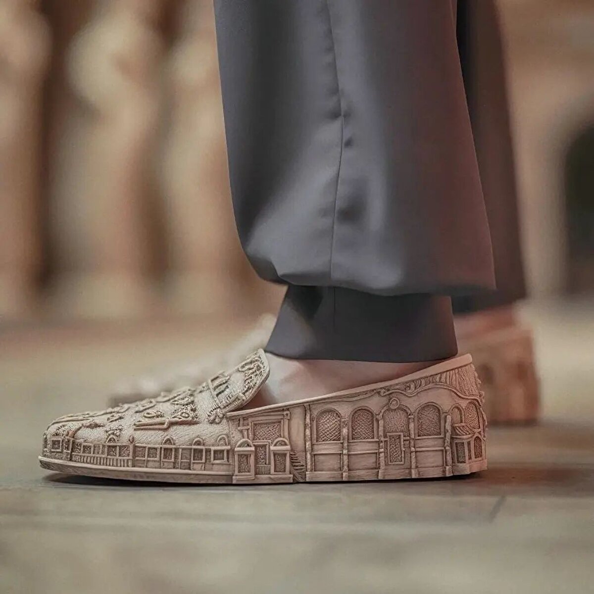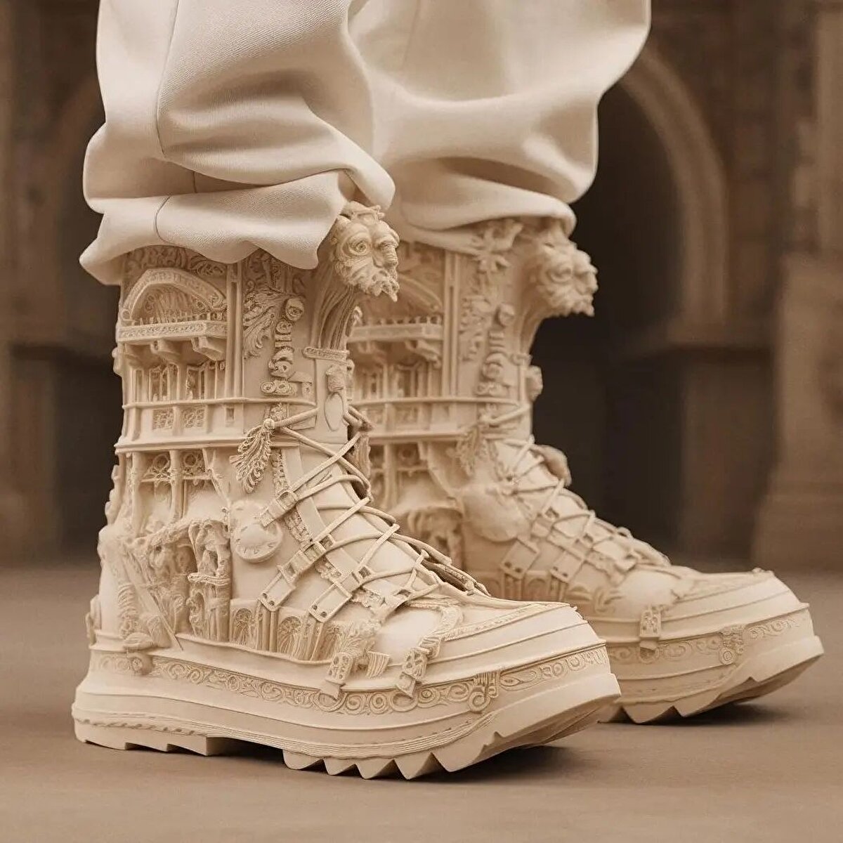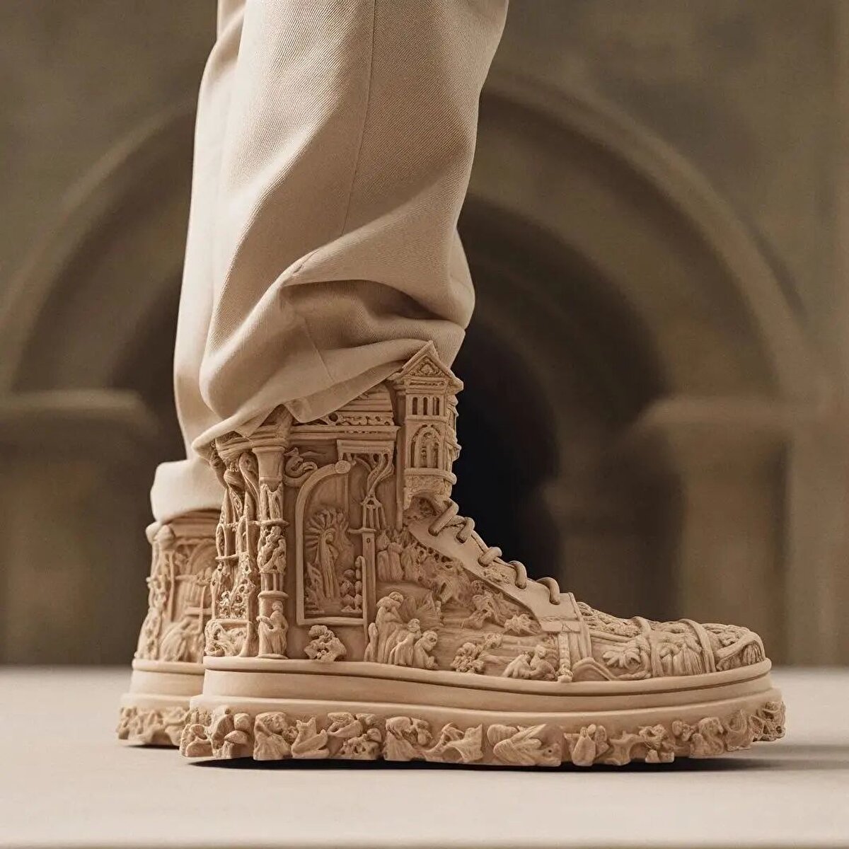 Str4ngeThing tarafından tasarlanan ve yapay zeka kullanarak oluşturulan ayakkabı koleksiyonu Rönesans mimarisinden ilham alan tasarımlar sunuyor.