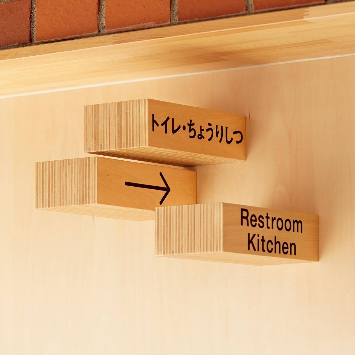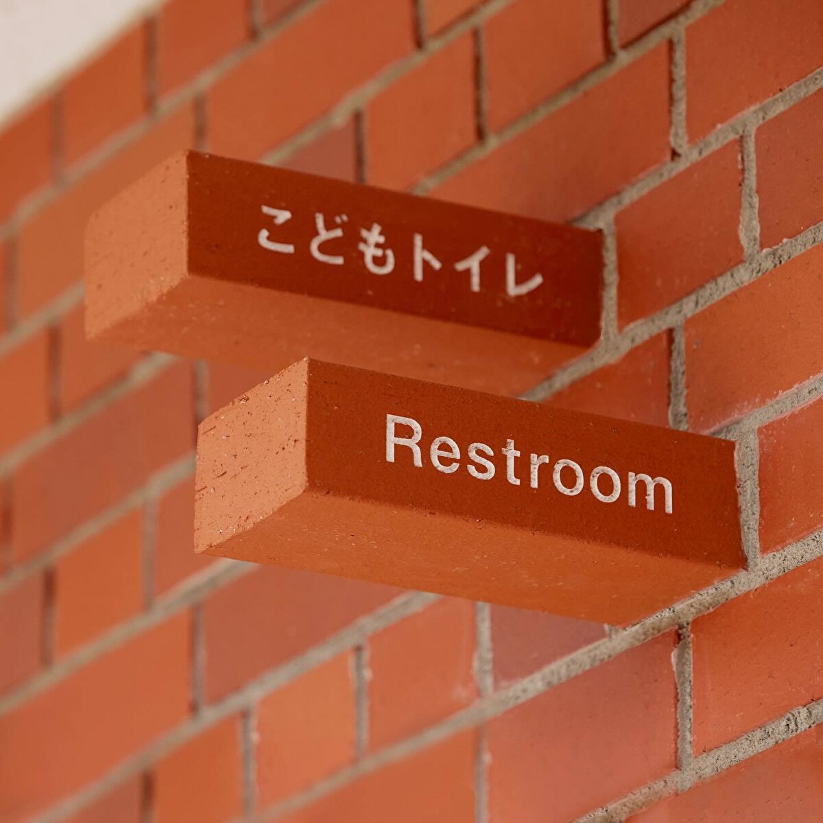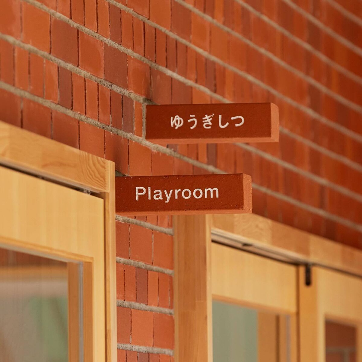 @6d_graphicdesign ve @6d_kishino, tuğladan yapılmış bu anaokulu binası için aynı malzemeden dışarı doğru uzanan yönlendirici tabelalar tasarladı.