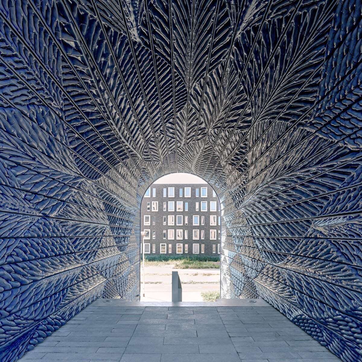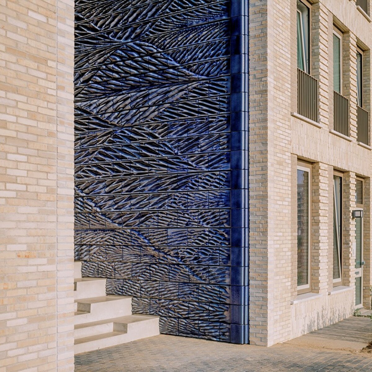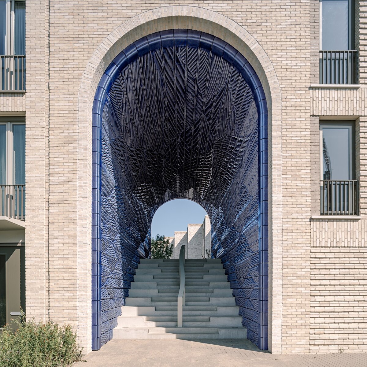 Yapının merkezinde yer alan yeşil bir ortak avluya açılan bu kemerler, canlı mavi tonlarla kaplanan yaprak desenli karolarla süsleniyor. Delft'in 'blue' porselen tabaklarından ilham alan tasarım, şeffaf mavi bir sır ve koyu mavi tonlarını yansıtıyor. Yapılan müdahale, binanın toprak tonlarındaki tuğla işçiliğine kontrast bir uyum sağlıyor.