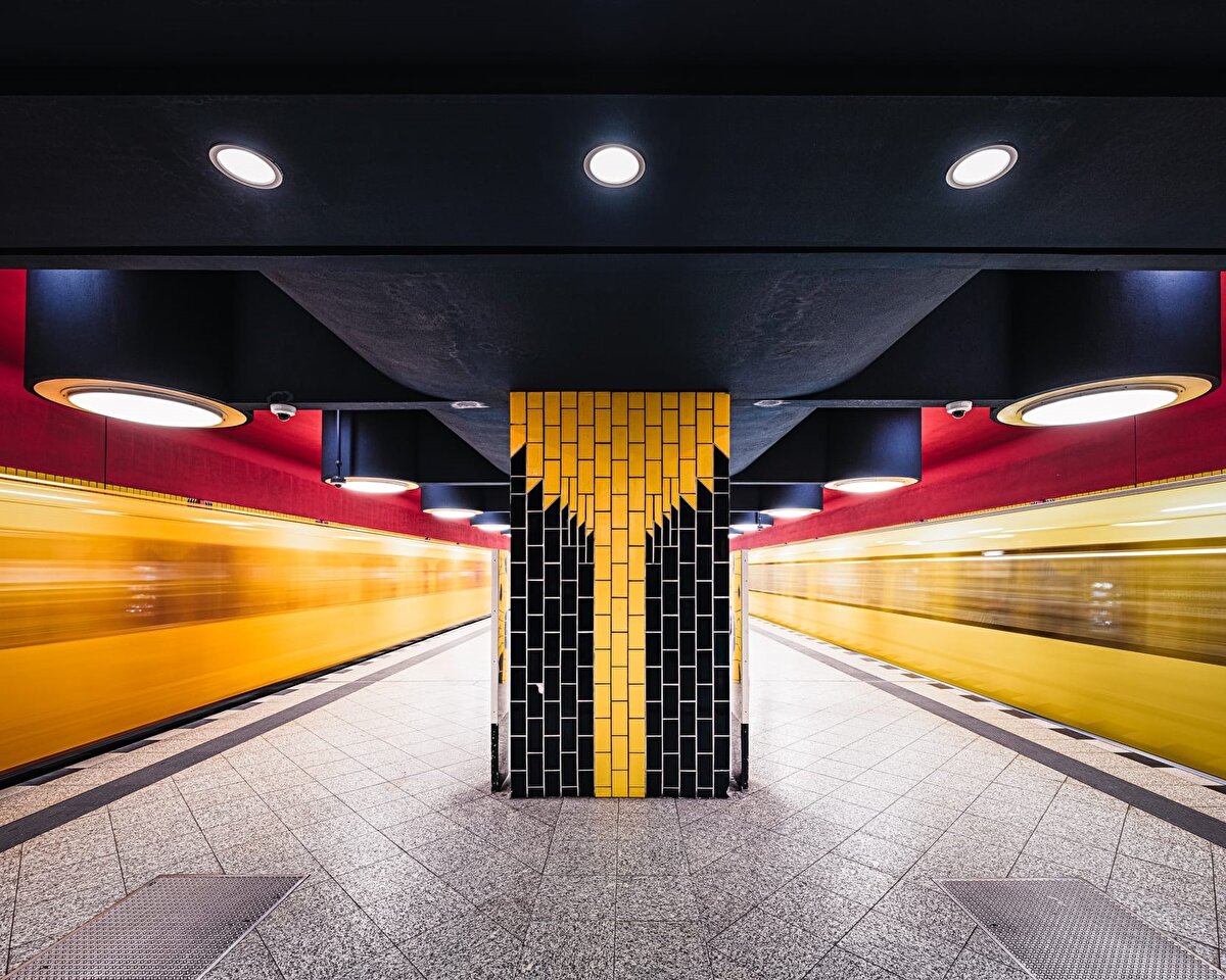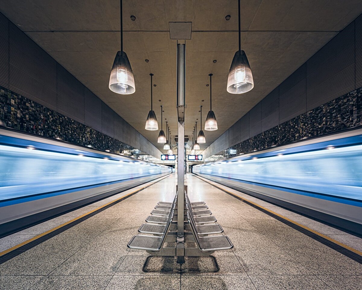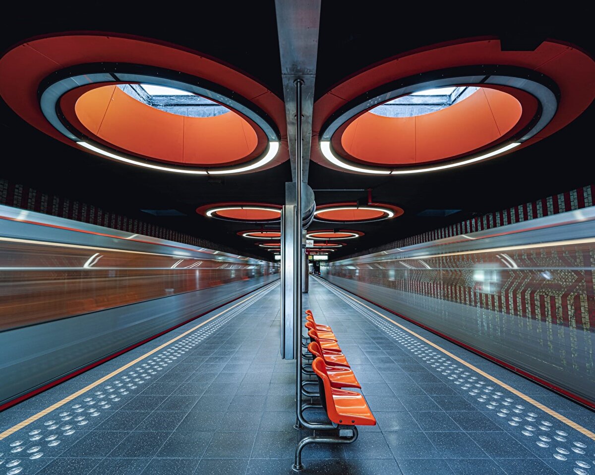 Thibault Drutel, Hamburg'dan Berlin'e, Münih ve Brüksel üzerinden Stockholm'e uzanan, Avrupa metrolarının mimari simetrilerine odaklanıyor. Simetrik Metro adlı çalışmasında, tren geçiş anlarını yakalayarak iç mekânların görsel düzenini ve hareketle kurduğu ilişkiyi araştırıyor.