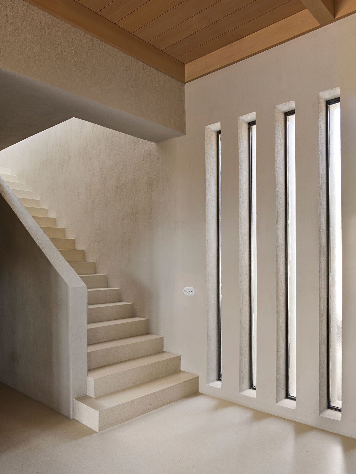 4 metreye ulaşan tavan yüksekliğiyle yapıda hacimsel bir ferahlık ve açıklık meydana getiriliyor. Zemin döşemesinde tek bir malzeme tercih edilerek, açık tonlardaki meşe ahşap kaplamalar ile iç mekanda hem yalın hem de gün ışığından maksimum fayda sağlayan bir atmosfer oluşturuluyor.