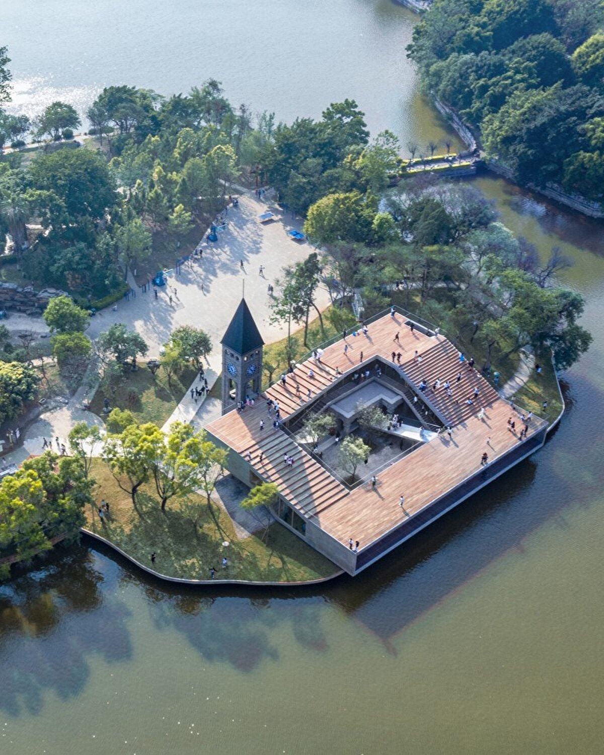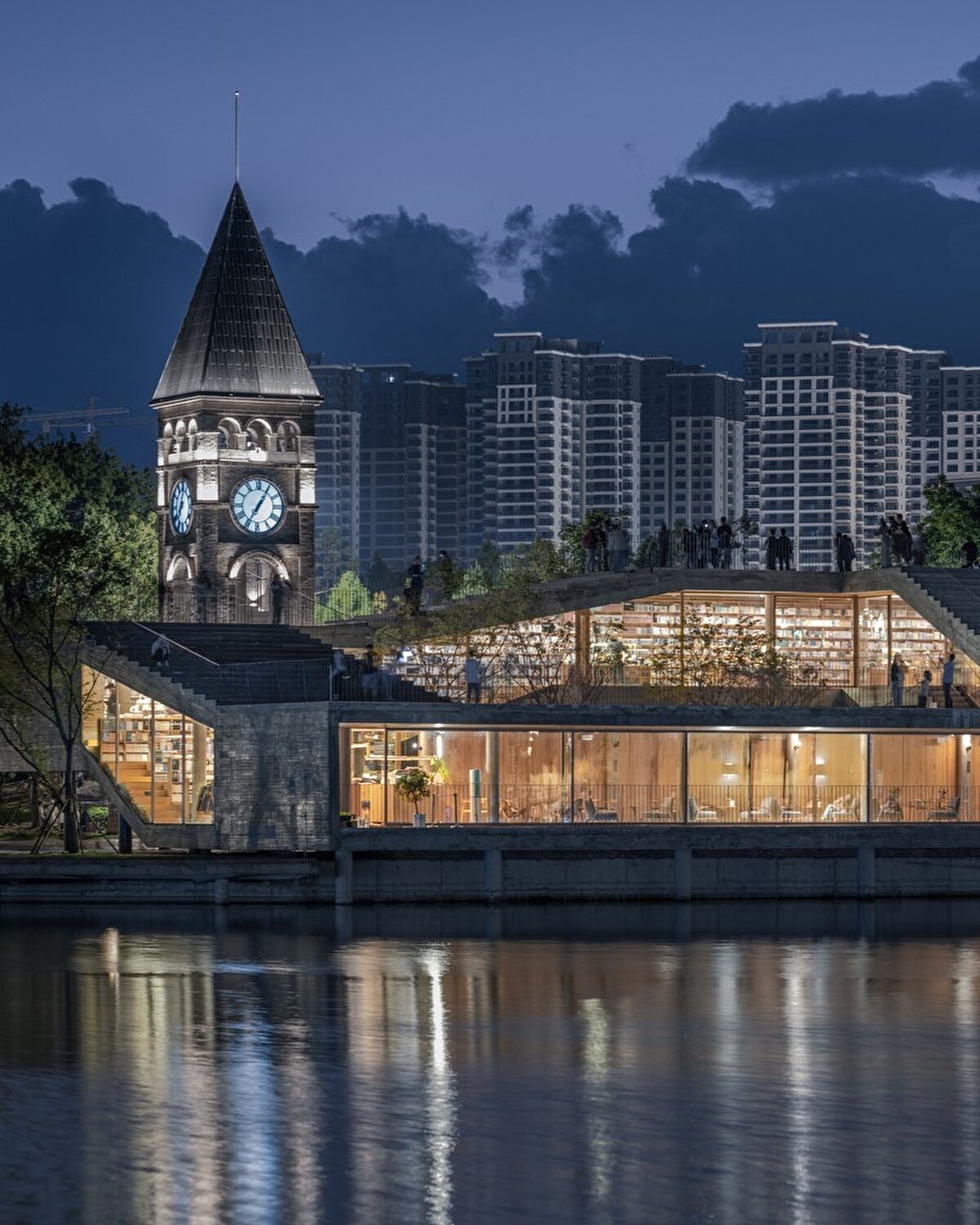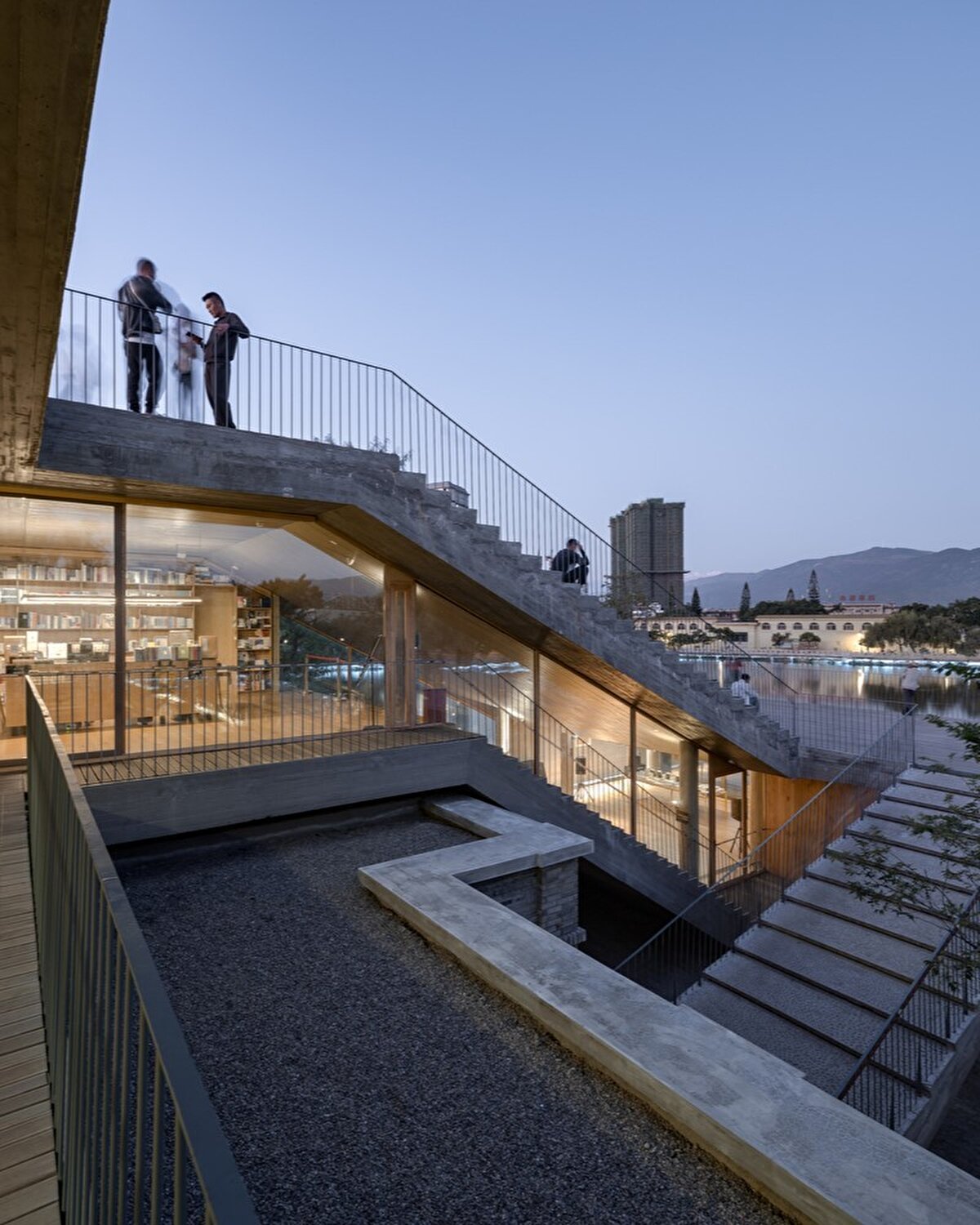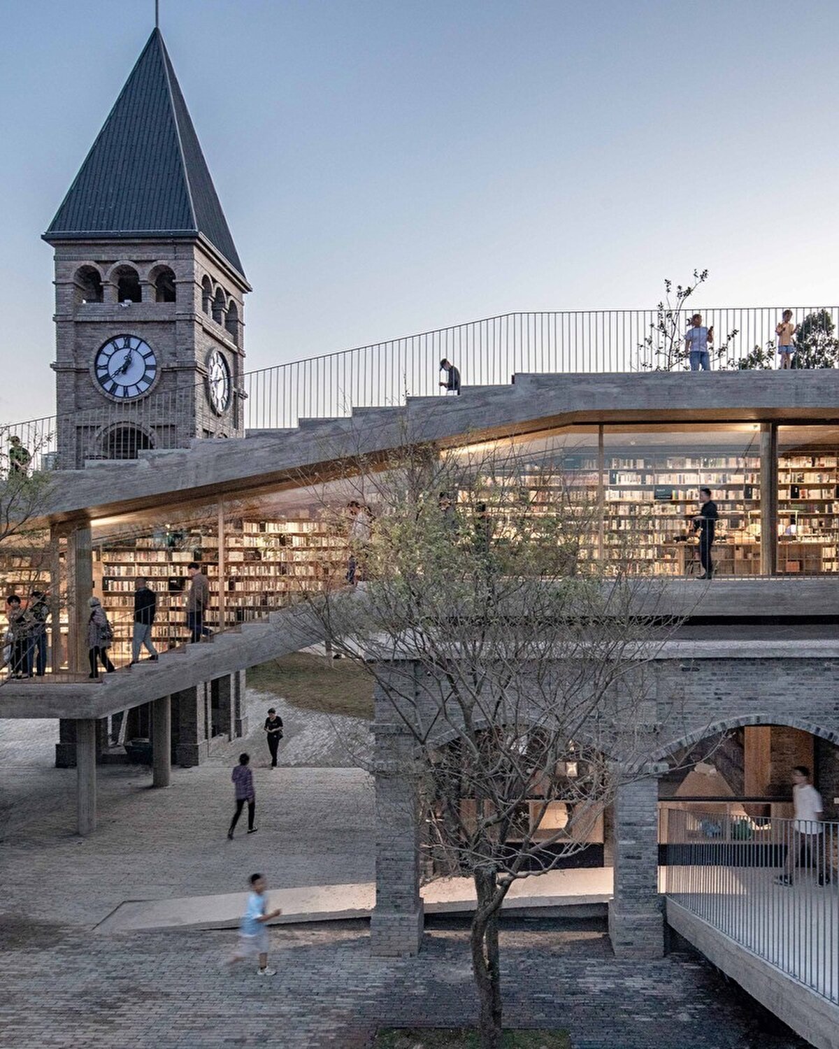 Mengzi NSAU Kitabevi, ZAO/standardarchitecture tarafından tasarlanıyor. Ekip, projede mevcut yapıları koruma ve yeni yapılarla bütünleştirme yaklaşımını benimsiyor. Eski beton tavernalar ve çan kulesi gibi mevcut yapılar kısmen korunuyor ve cepheler gri tuğlalarla yenileniyor. Yeni yapı, göl kıyısından başlayarak mevcut salon ve çan kulesi üzerine tırmanan ve tekrar göle inen kıvrımlı bir döngü şeklinde tasarlanıyor. Bu tasarım, ziyaretçileri göl kıyısından çatı terasına yönlendirerek, şehir manzarasını farklı açılardan deneyimlemelerini sağlıyor.