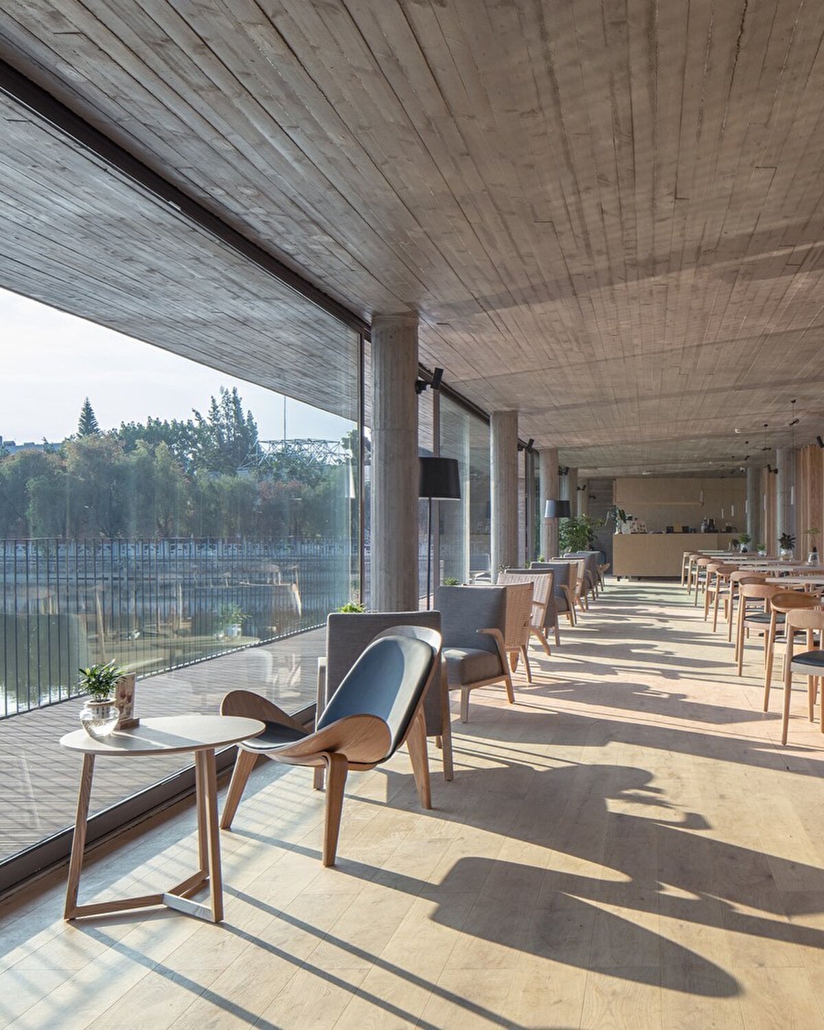 Malzeme seçiminde, dış mekân ve iç mekân arasındaki geçişleri yumuşatmak amacıyla ham beton ve doğal ahşap kullanılıyor. Bu malzemeler, iç ve dış mekânlarında devamlılık sağlayarak, mekânsal deneyimi zenginleştiriyor.
