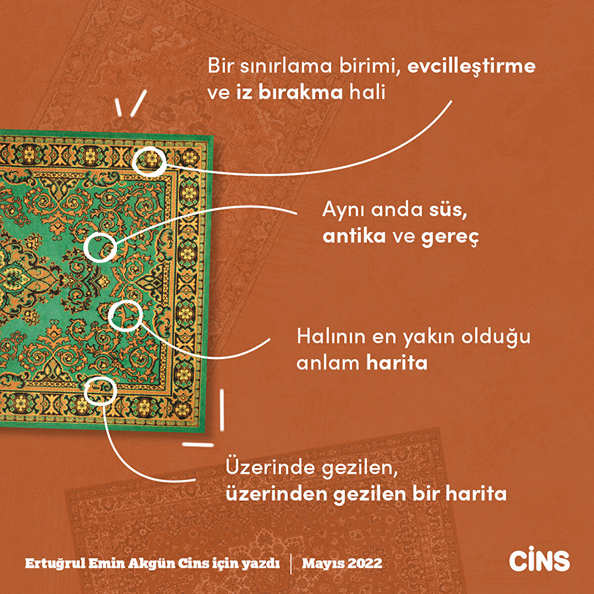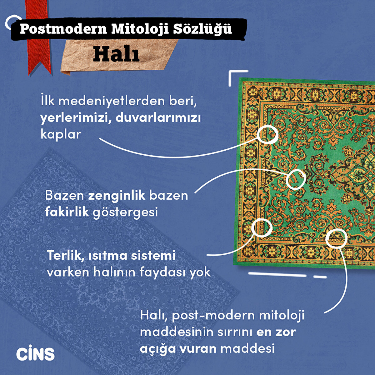 Modern mitoloji sözlüğünde, maddenin tarihine inilir ve yolculuğu üzerine esaslı bir tahlil yapılır. İşte bu noktada da diyebiliriz ki, bir halıya varlığından bu yana büyük anlamlar yüklenebilir. Örneğin: