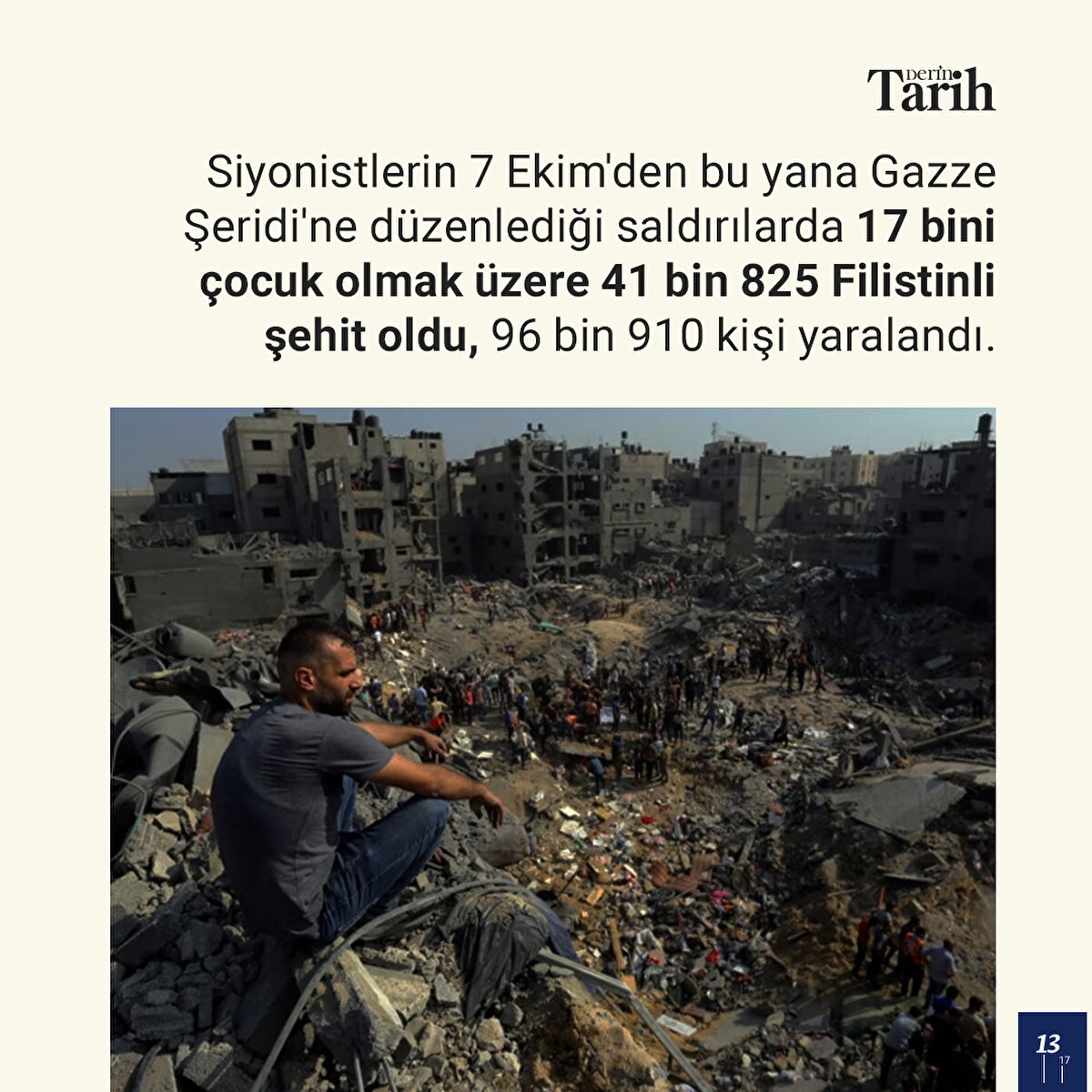 İsrail ordusu, 7 Ekim 2023'ten bu yana saldırılarını sürdürdüğü Gazze Şeridi'nde Filistinli 902 aileyi tüm fertlerini öldürerek yok etti. 1940'lı yıllardan itibaren Filistinlilerin sistematik şekilde katledilmesine göz yuman ABD ve Avrupa, Hamas'ın sivilleri öldürdüğünü söyleyerek İsrail'e her türlü desteklerini açıkladılar. Siyonistlerin 7 Ekim'den bu yana Gazze Şeridi'ne düzenlediği saldırılarda 17 bini çocuk olmak üzere 41 bin 825 Filistinli şehit oldu, 96 bin 910 kişi yaralandı. İşgal altındaki Batı Şeria ve Doğu Kudüs'te de 7 Ekim'den bu yana 741 Filistinli şehit oldu.
