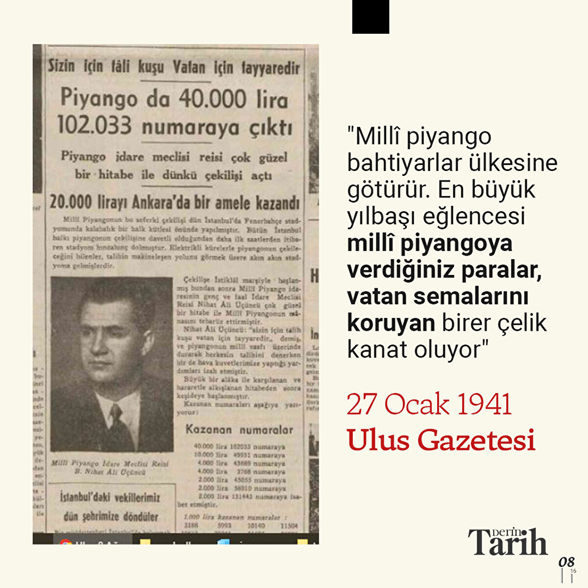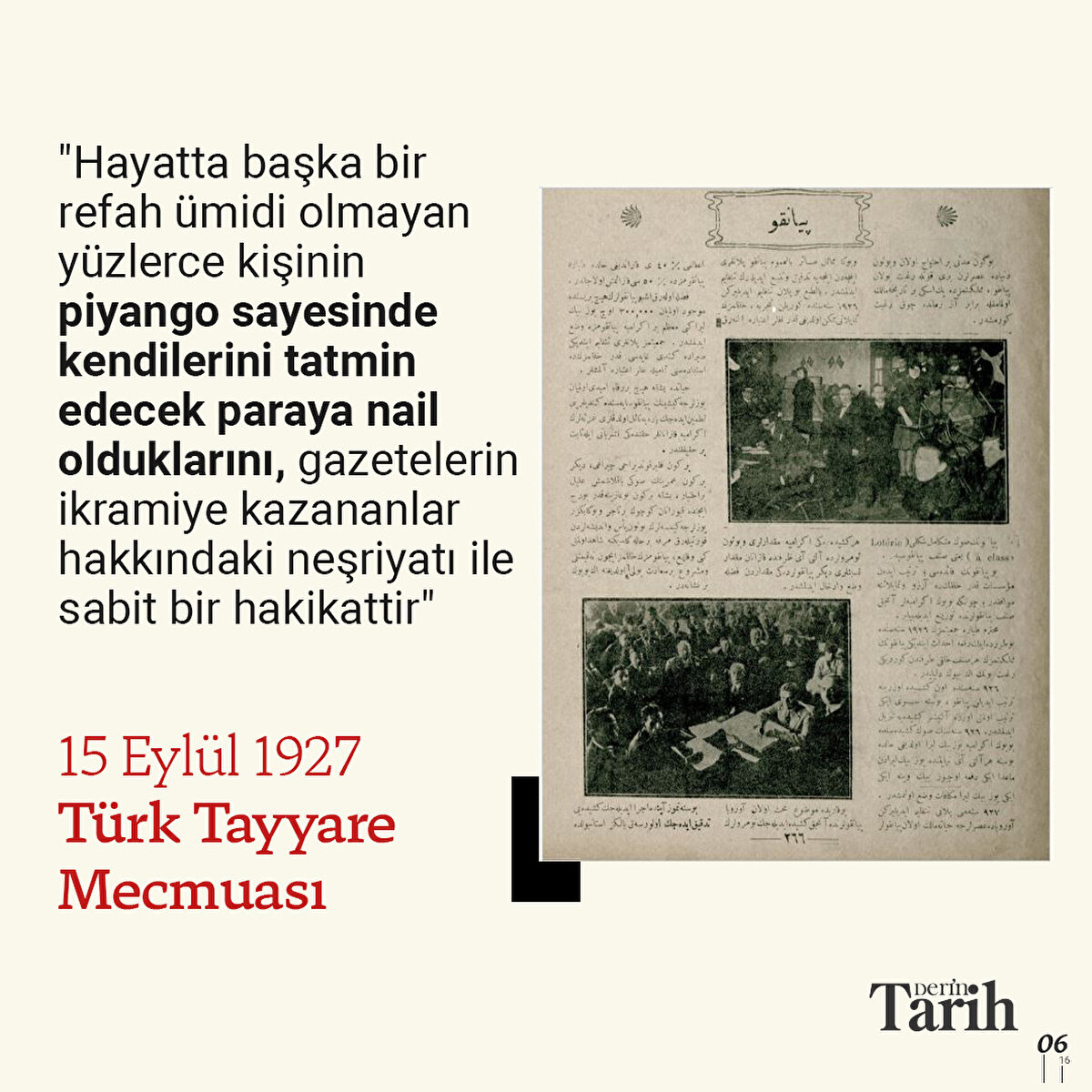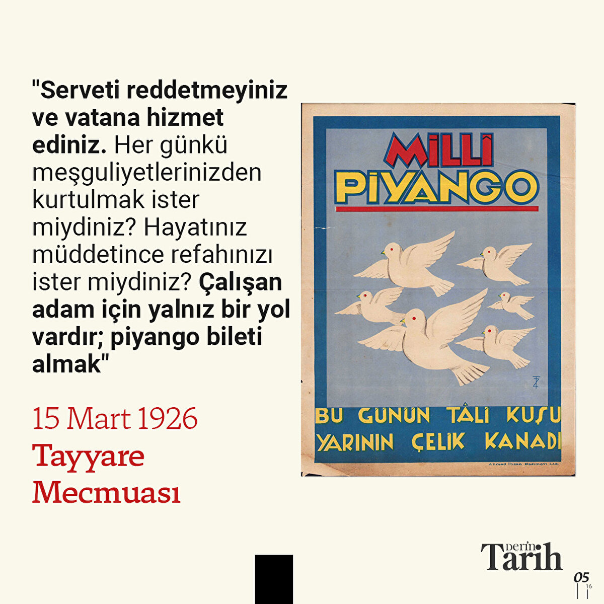 Bir dönem ülkemizde “bir vatan hizmeti” olarak tanımlanan piyango dilimize İtalyanca “beyaz” mânâsına gelen “bianco” kelimesinden geçmiştir. Kura sonucunda beyaz kâğıdı çeken kişinin kazandığı bianco oyunu, sonraları piyango olarak kabul görmüştür. Cumhuriyetin ilanından sonra, ülkenin hava savunma gücüne katkı sağlamak amacıyla 9 Ocak 1926 tarihli ve 710 sayılı kanunla karşılığı nakit ödenmek üzere piyango düzenleme hakkı Türk Tayyare Cemiyeti'ne verilmiş olup 1939 yılında Millî Piyango İdaresi kurulmuştur