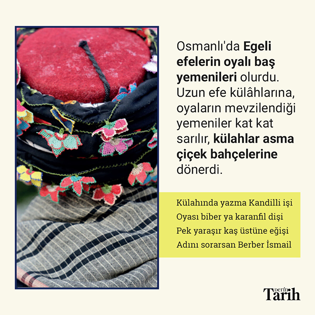 Reşad Ekrem Koçu, bilhassa ayak takımından delikanlıların külâhlarına oyalı yemeniler sardıklarını ifade eder. Egeli efeler arasında da oyalı baş yemenileri pek makbuldü. Uzun efe külâhlarına, oyaların mevzilendiği yemeniler kat kat sarılır, külahlar adeta asma çiçek bahçelerine dönerdi. Delikanlılar ekseriyetle biber oya tercih ederlerdi. 2-2,5 santim boyundaki kırmızı sivri biber, beyaz keçeden külah üstünde sallanır, bunu takan delikanlı afili bir eda ile gezerdi.