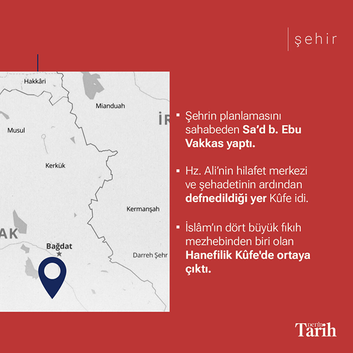 Sahabeden Sa'd bin Ebu Vakkas, Hz. Ömer'in emriyle Kûfe şehrini askeri bir üs olarak planladı ve kurdu. Ardından kabilelerin buraya iskan edilmesi için gayret gösterdi. Kûfe'nin kurulduğu yerin, özellikle bölgede yapılacak askeri harekat için stratejik öneme ve zengin tarım havzalarına sahip olması ve ticari güzergah üzerinde bulunması gibi sebeplerle tercih edildiği anlaşılmaktadır. Askeri bir garnizon olarak kurulmakla birlikte zamanla bir şehre dönüşen Kûfe, bölgenin idari, ticari ve kültürel bakımdan gelişmesinde rol oynamış, bu özelliğiyle Hz. Ali ve ilk Abbasi halifeleri tarafından başşehir olarak tercih edilmiştir.