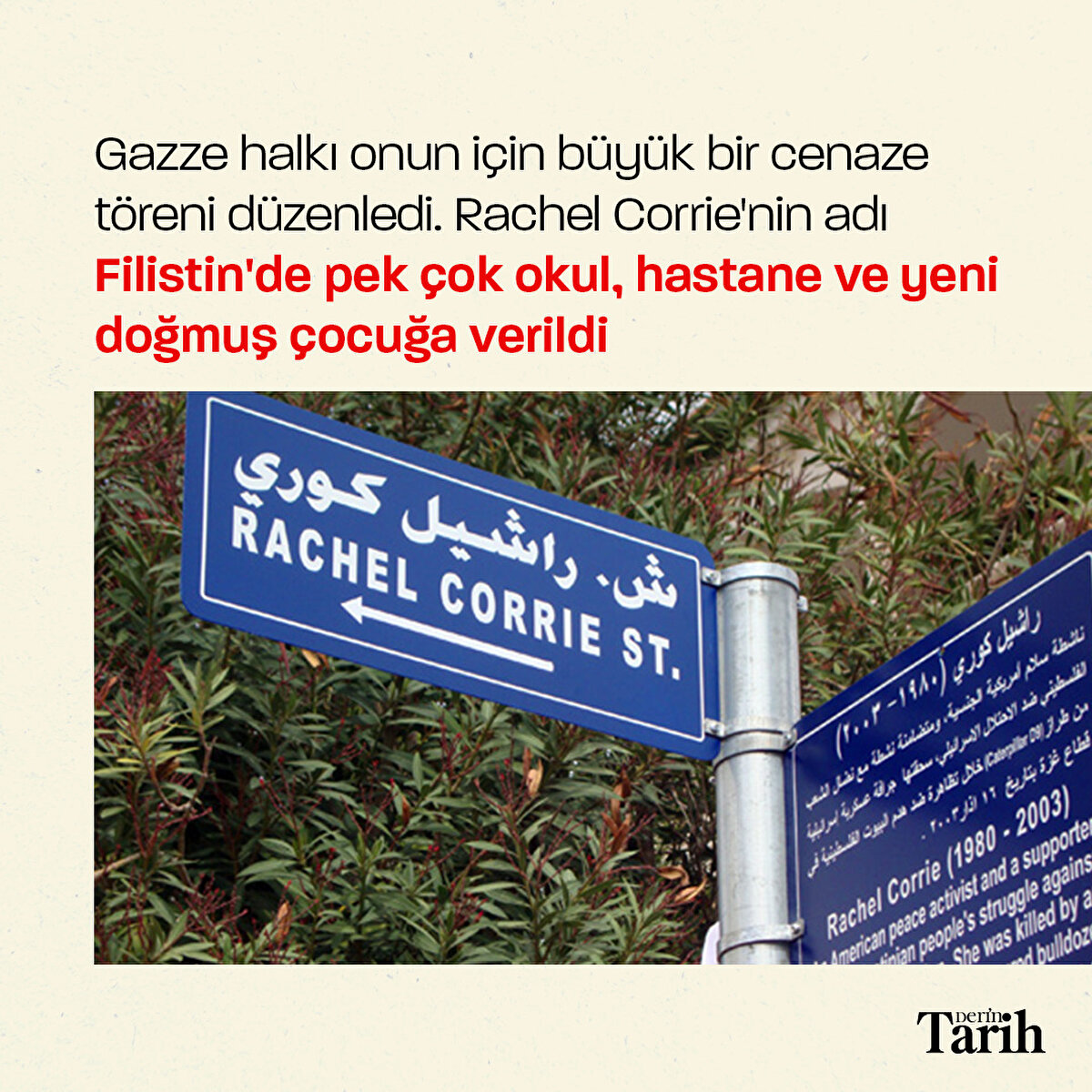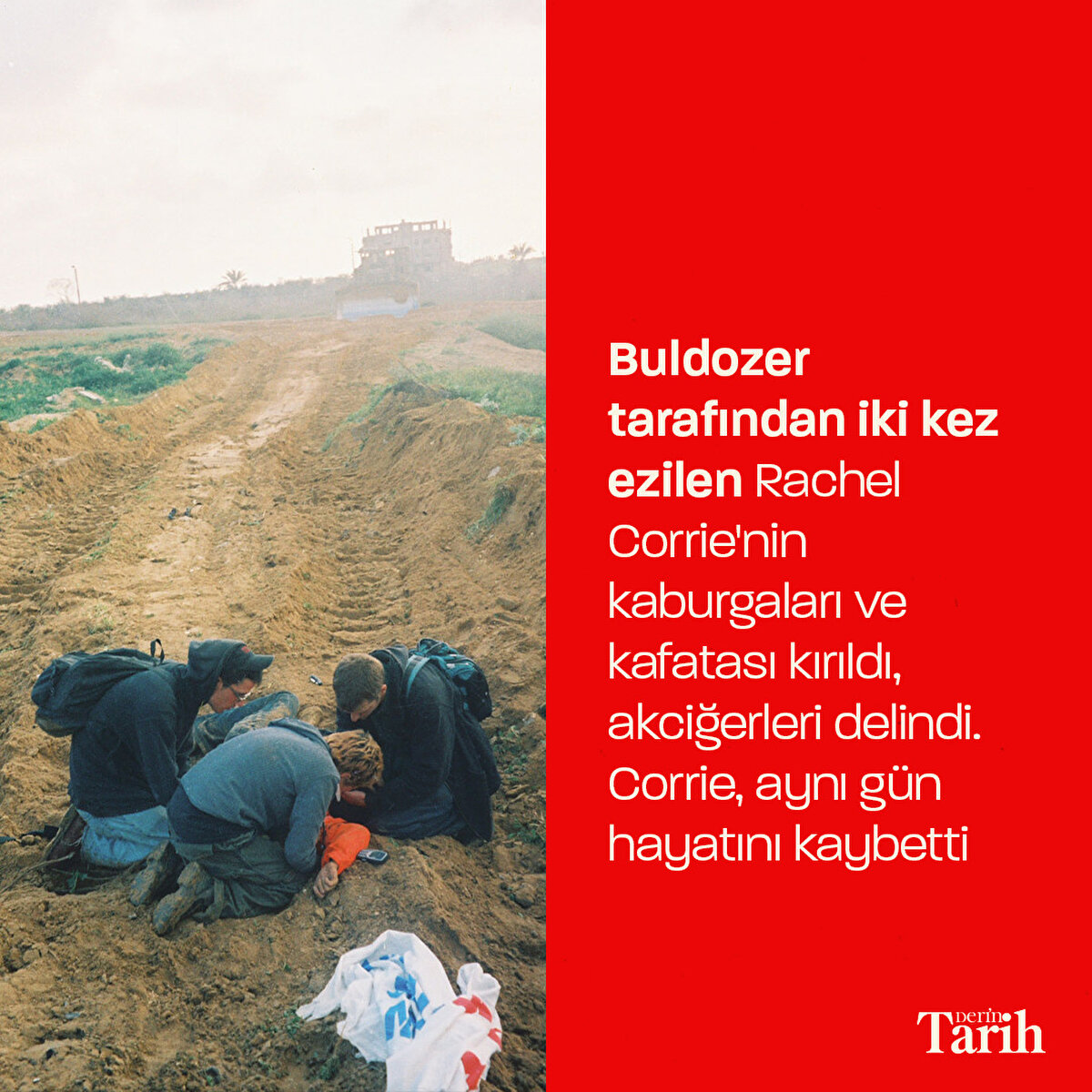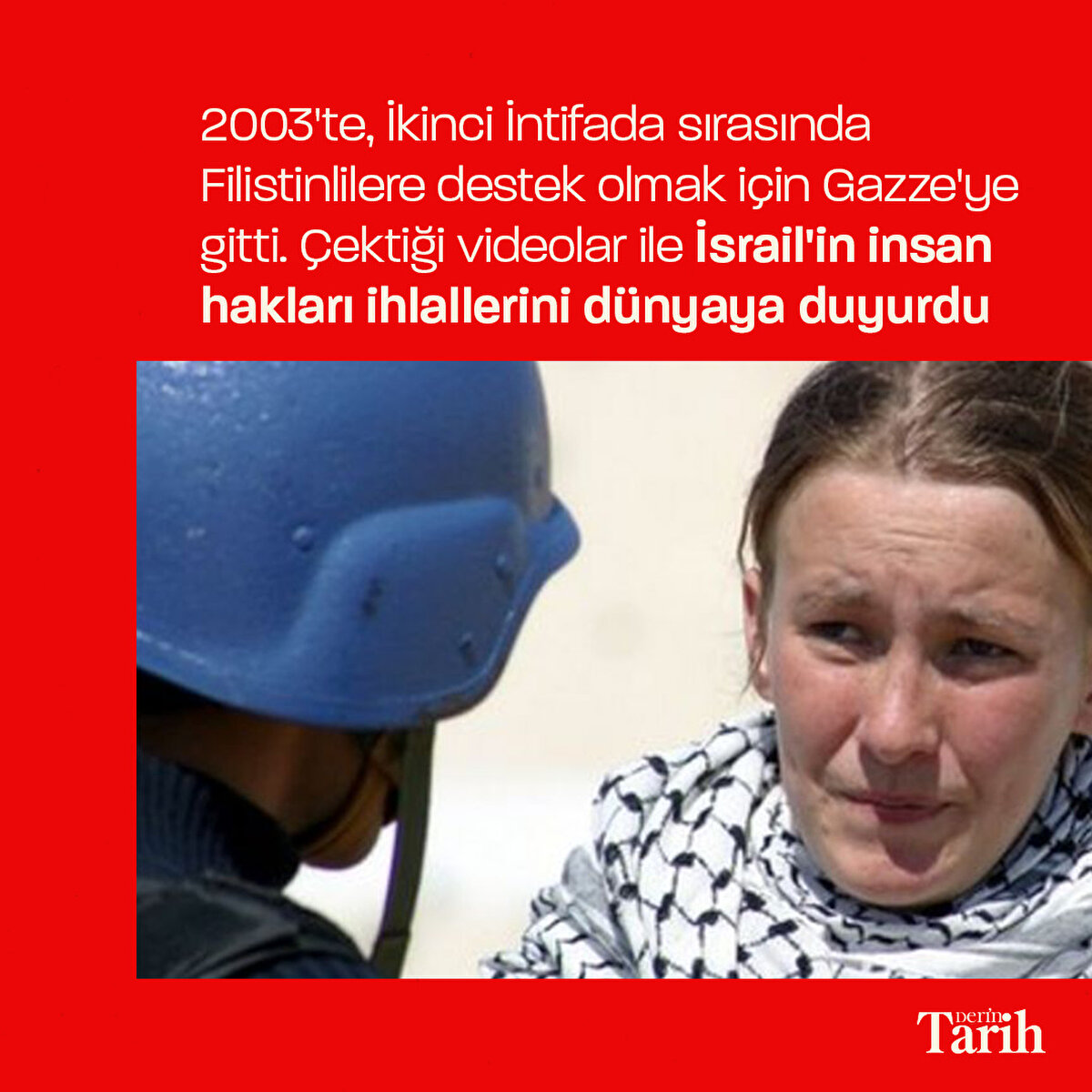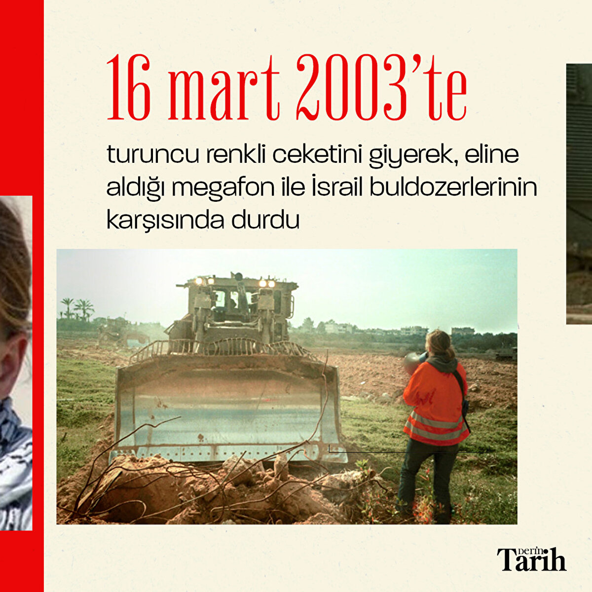 İsrail'in zulmünü dünyaya duyurmak için Filistin'e giden insan hakları savunucusu Rachel Corrie, 16 Mart 2003'te İsrail tarafından buldozerle ezilerek vahşice katledildi.