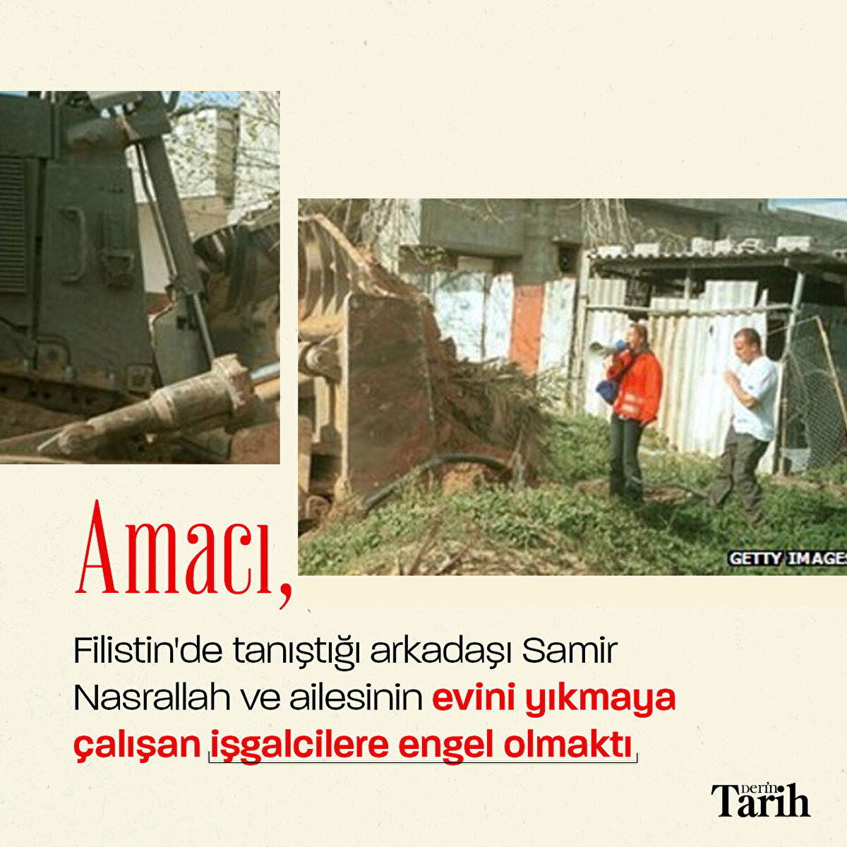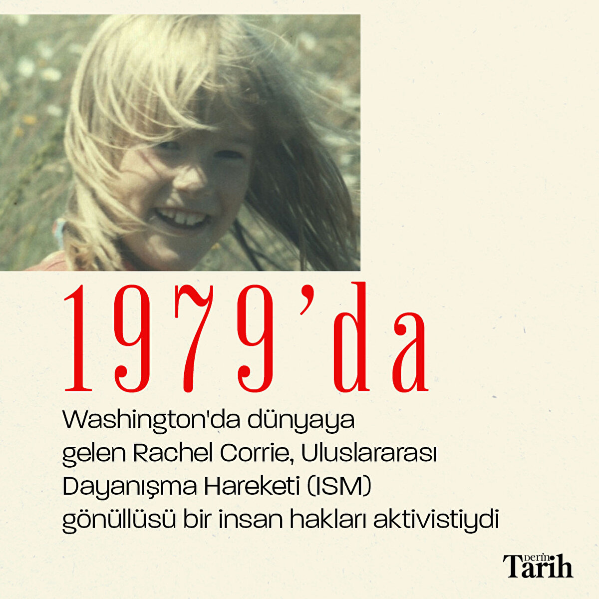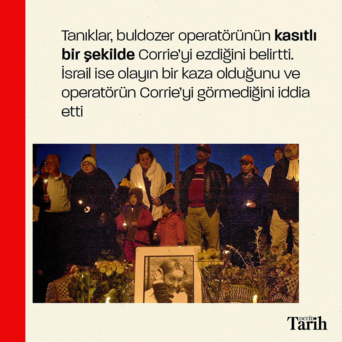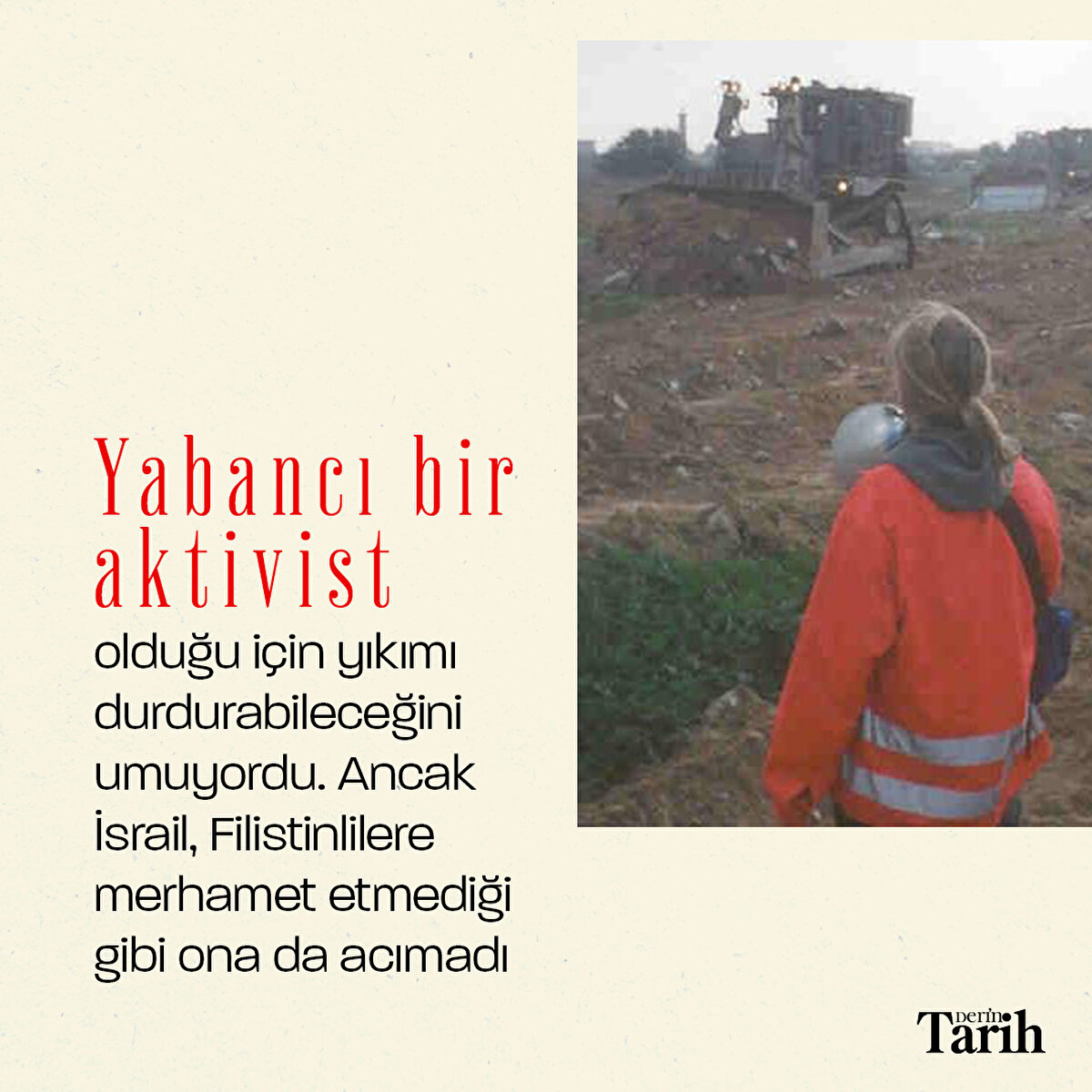 İsrail'in zulmünü dünyaya duyurmak için Filistin'e giden insan hakları savunucusu Rachel Corrie, 16 Mart 2003'te İsrail tarafından buldozerle ezilerek vahşice katledildi.