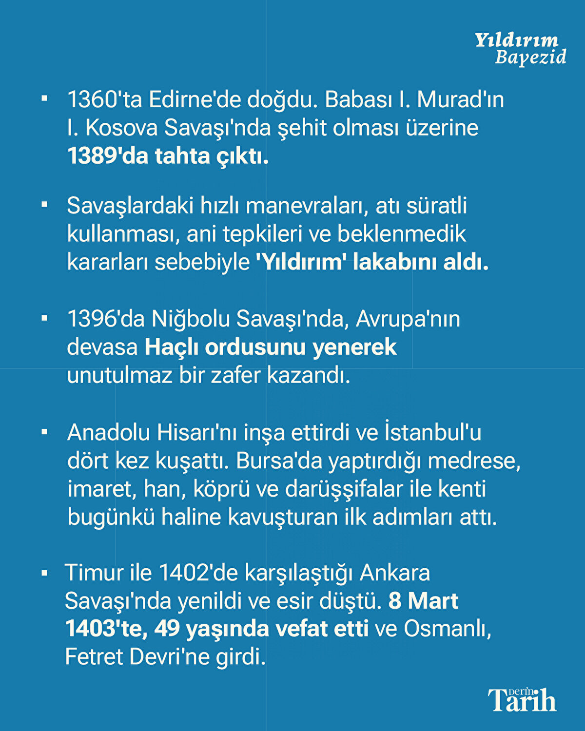 Osmanlı'nın dördüncü padişahı Bayezid Han, savaşlardaki hızlı manevraları, atı süratli kullanması, ani tepkileri ve beklenmedik kararları sebebiyle 'Yıldırım' lakabını aldı.