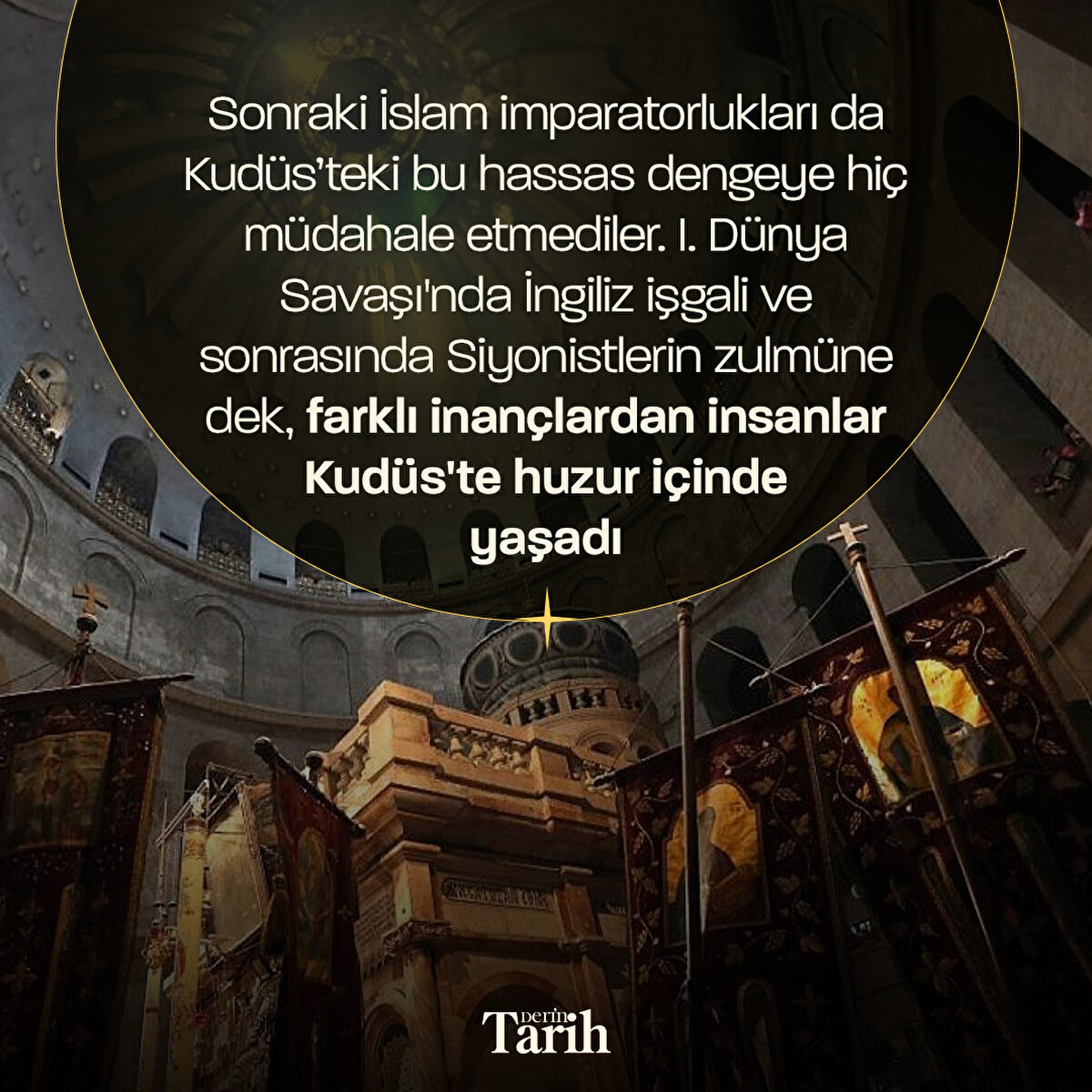 Hz. Ömer, Kıyame Kilisesi anahtarlarını Müslüman bir aileye vererek Kudüs'ün dini ve hassas dengelerini korumuş, Selahaddin Eyyubi de bunu devam ettirmişti. Asırlar boyunca Müslüman yöneticiler bu yöntemle Kudüs'te farklı inançlardan insanların bir arada huzur içinde yaşamasını sağladılar.