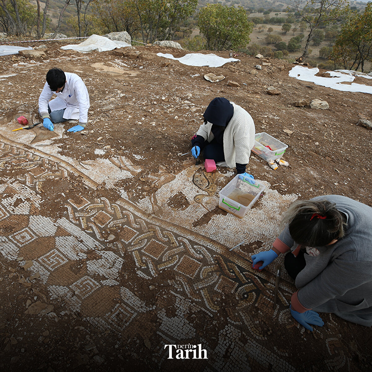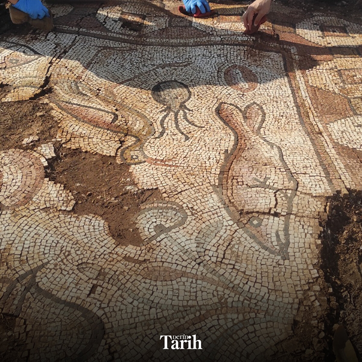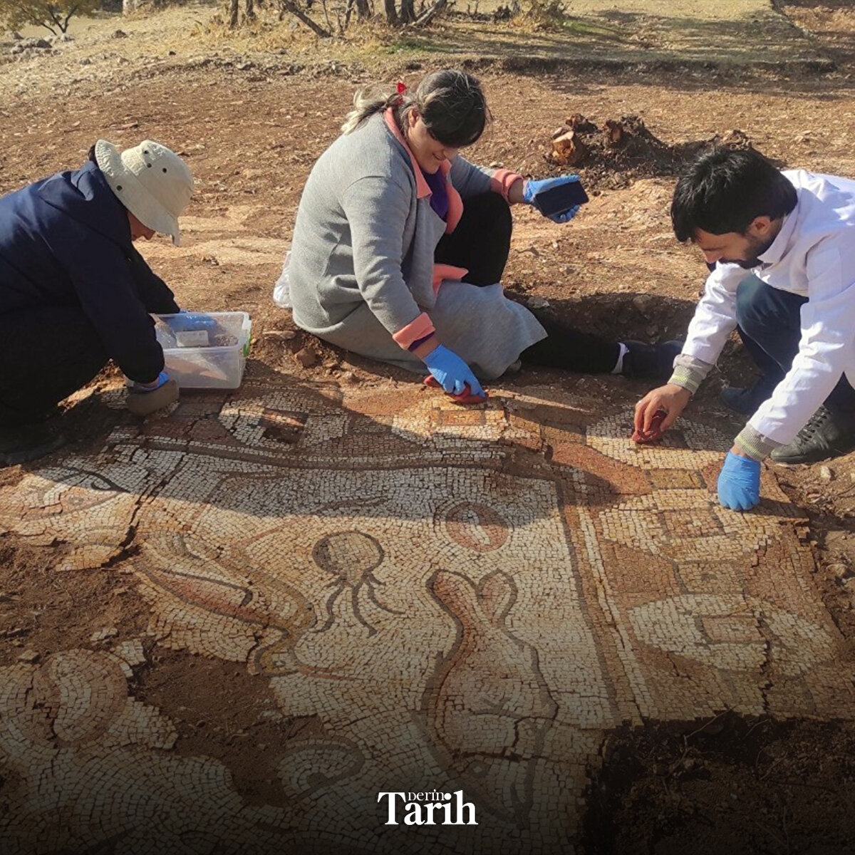 Mardin'in Kızıltepe ilçesinde, kurtarma kazısı yapılan alanda Roma dönemine ait villa kalıntısında deniz canlıları figürlü mozaikler bulundu.