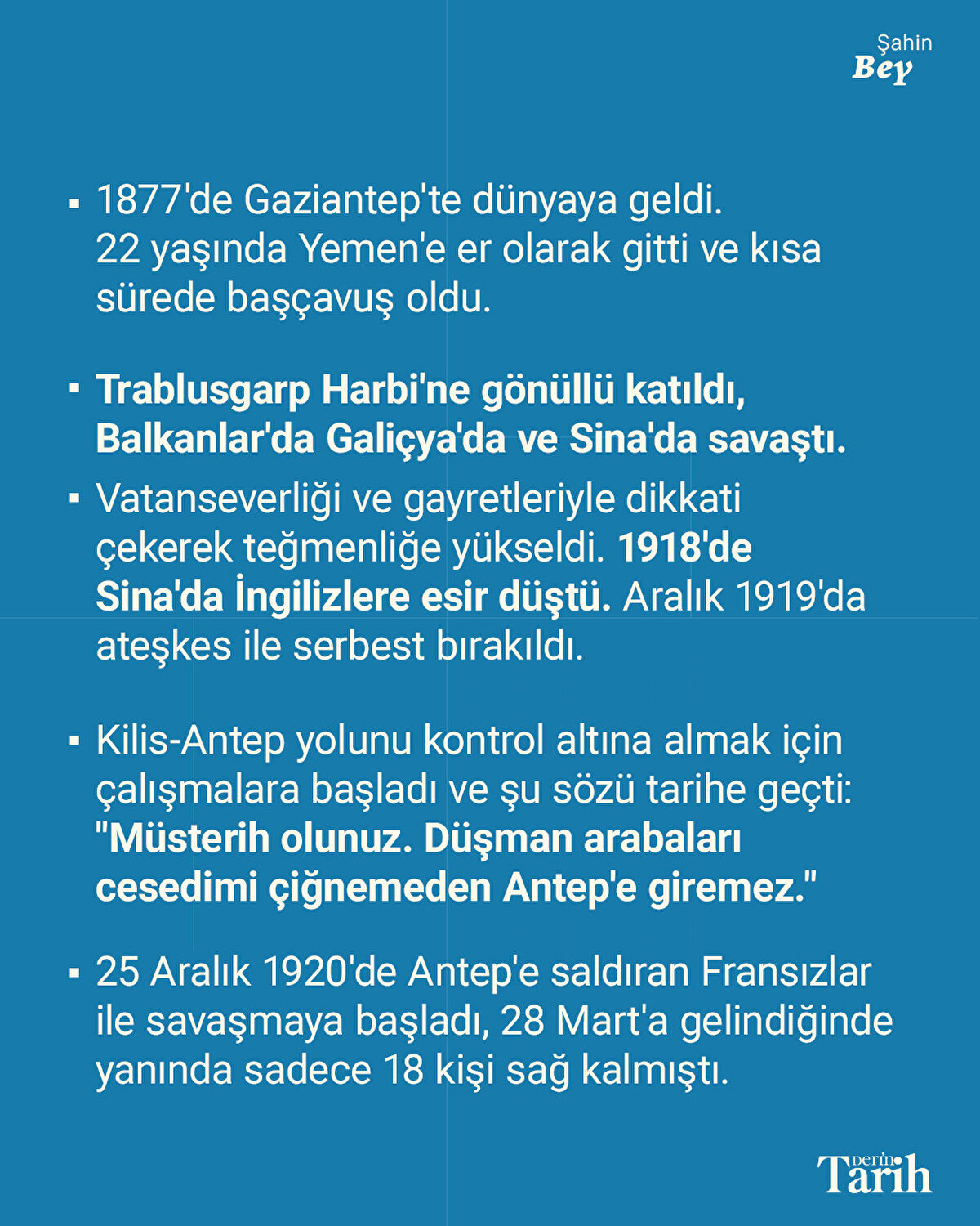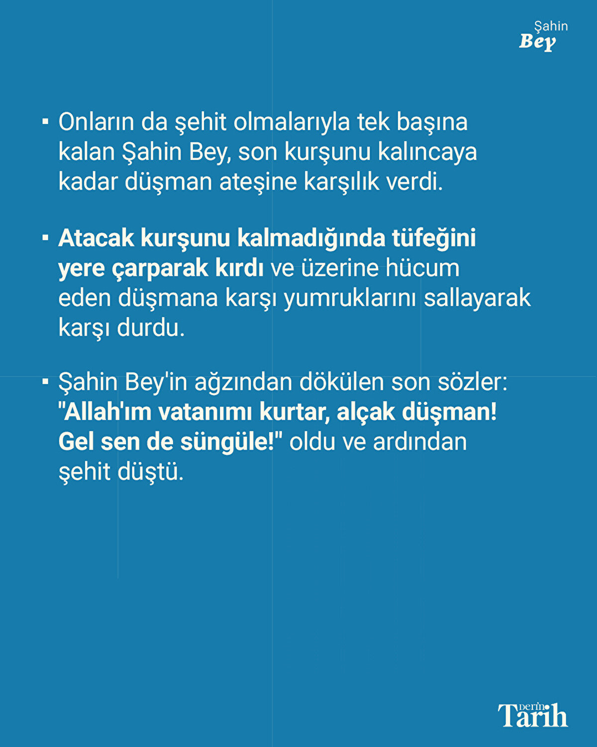 Gaziantep'i Fransız askerlerine karşı savunan Şahin Bey, kurşunu bittiğinde tüfeğini alıp dizinde kırarak yumruğuyla düşmana saldırdı. Tek başına, silahsız halde mücadele ederken 28 Mart 1920'de şehit düştü.