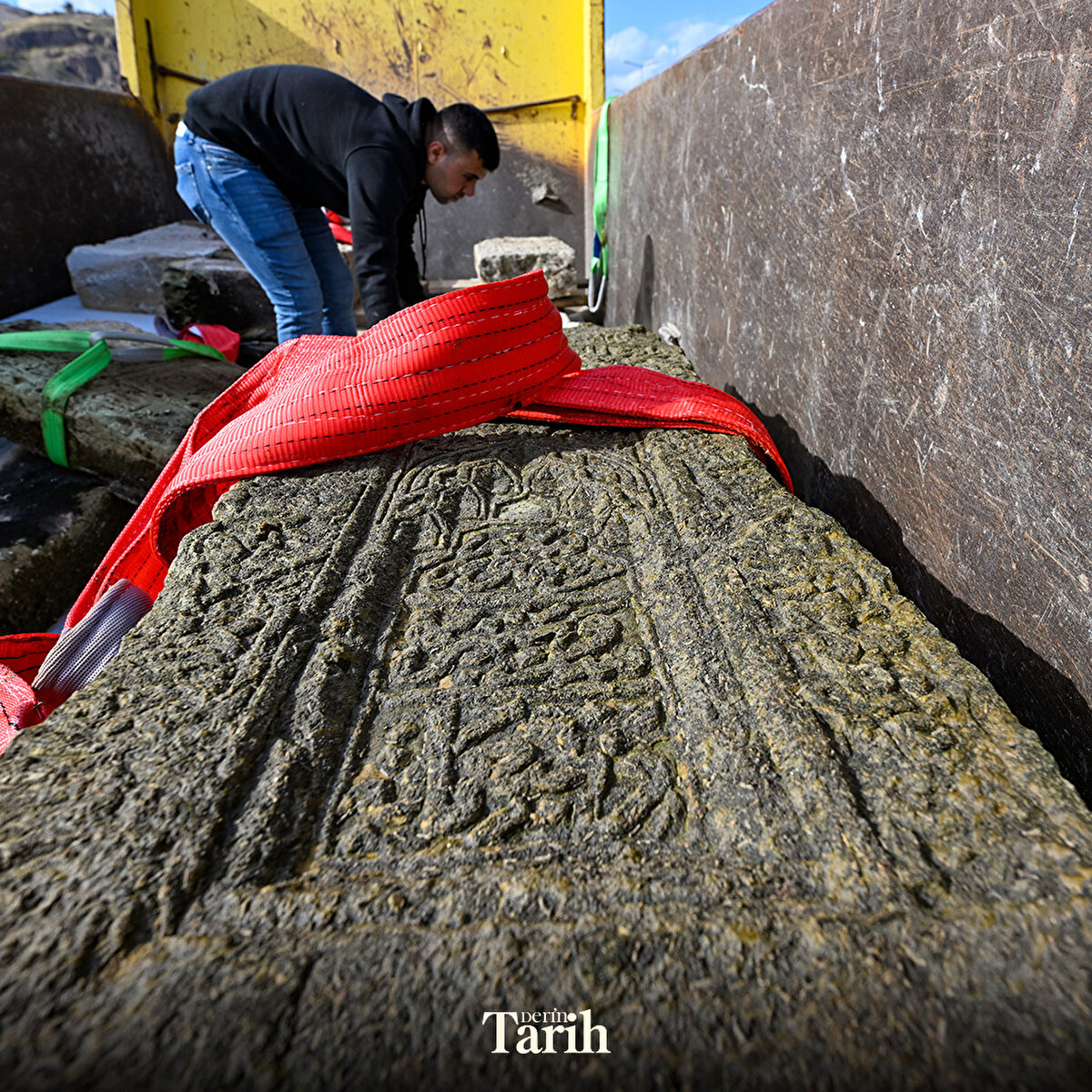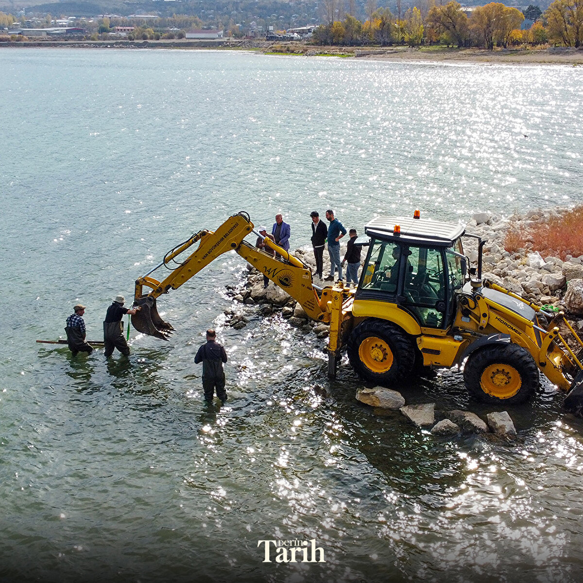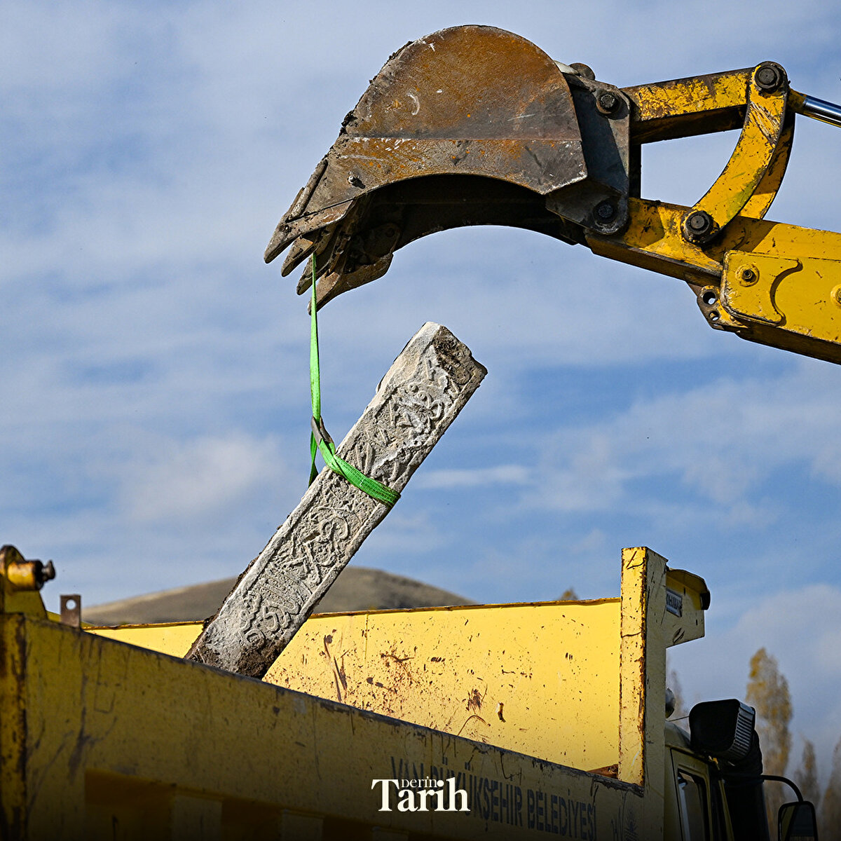 Yağışların azalması ve aşırı buharlaşma sonucu seviyesi düşen Van Gölü'nün kıyı kesimlerinde ortaya çıkan Selçuklu dönemine ait tarihi mezar taşları koruma altına alındı.