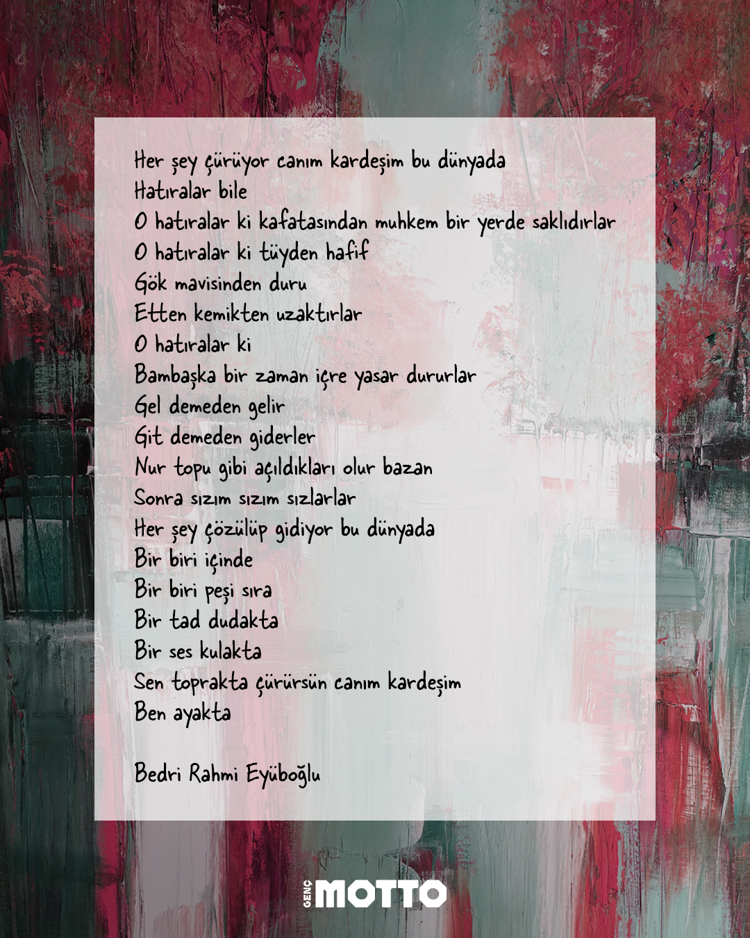 Her şey çürüyor canım kardeşim bu dünyada Hatıralar bile O hatıralar ki kafatasından muhkem bir yerde saklıdırlar O hatıralar ki tüyden hafif Gök mavisinden duru Etten kemikten uzaktırlar O hatıralar ki Bambaşka bir zaman içre yaşar dururlar Gel demeden gelir Git demeden giderler Nur topu gibi açıldıkları olur bazan Sonra sızım sızım sızlarlar Her şey çözülüp gidiyor bu dünyada Bir biri içinde Bir biri peşi sıra Bir tad dudakta Bir ses kulakta Sen toprakta çürürsün canım kardeşim Ben ayakta Bedri Rahmi Eyüboğlu