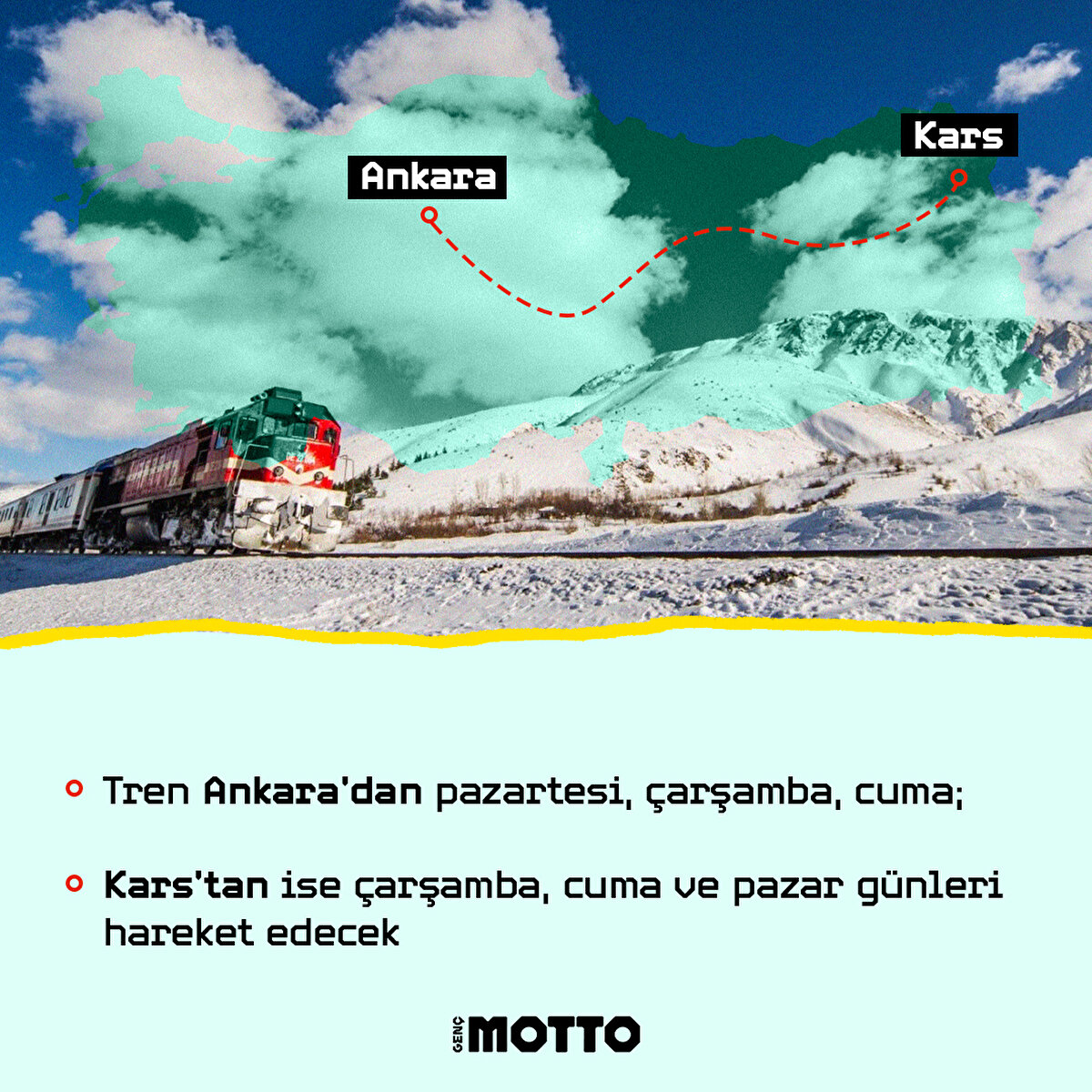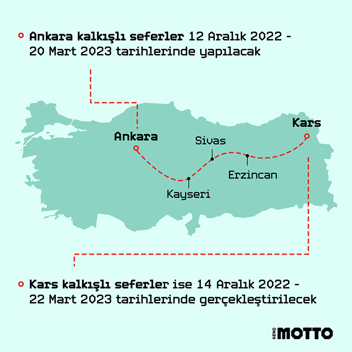 Anadolu'nun farklı kültürlerini ve güzelliklerini görmek için güzel bir seçenek olan Doğu Ekspresi Aralık'ta seferlerine başlıyor. Ankara kalkışlı seferler 12 Aralık 2022-20 Mart 2023 tarihlerinde yapılacak. Kars kalkışlı seferler ise 14 Aralık 2022-22 Mart 2023 tarihleri arasında gerçekleştirilecek. Tren Ankara'dan pazartesi, çarşamba, cuma, Kars'tan ise çarşamba, cuma ve pazar günleri hareket edecek.