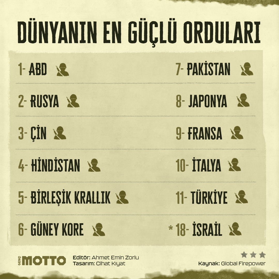Dünyanın en güçlü orduları 2023 verilerine göre Türkiye 2 basamak yükselerek 11. sırada yerini aldı ⚔️