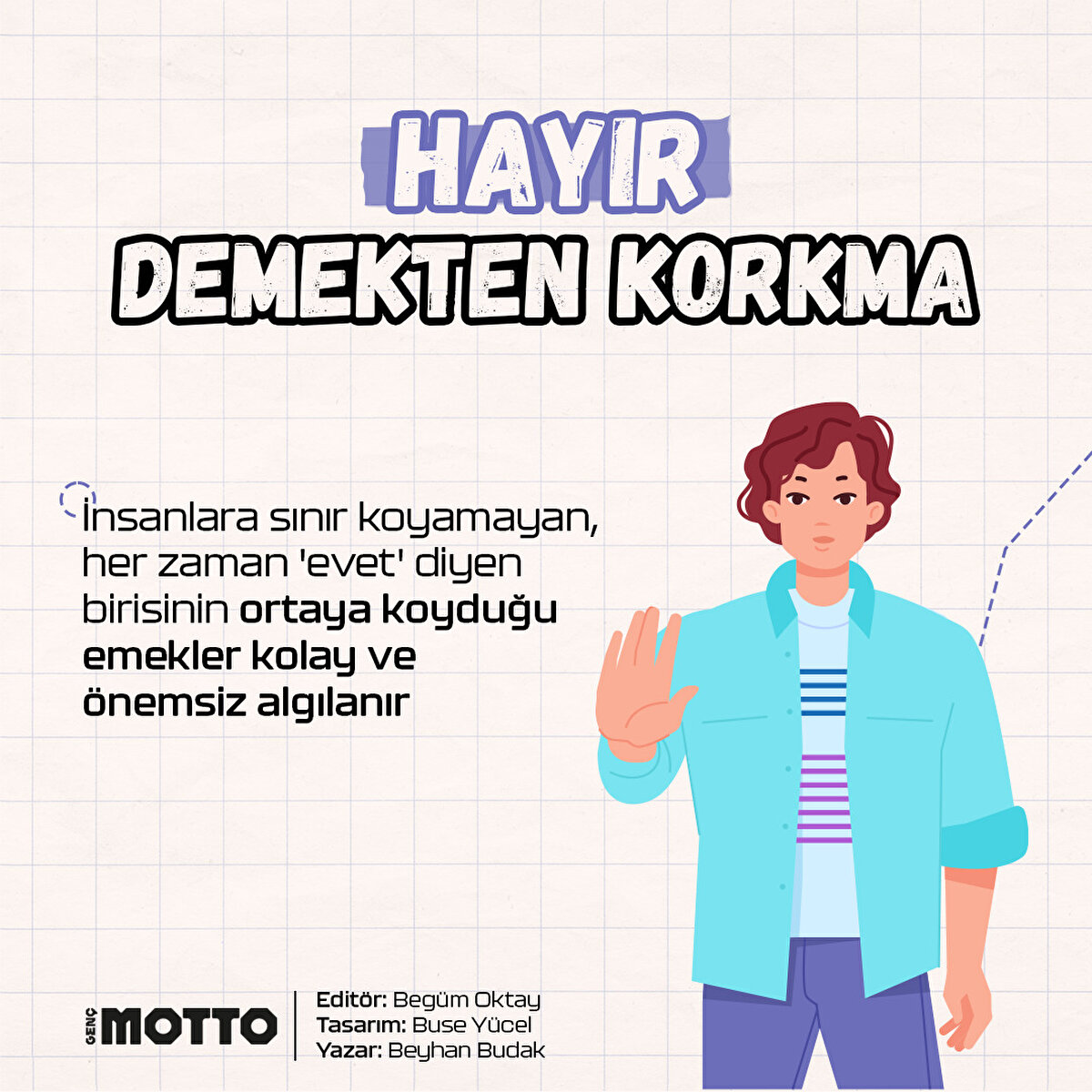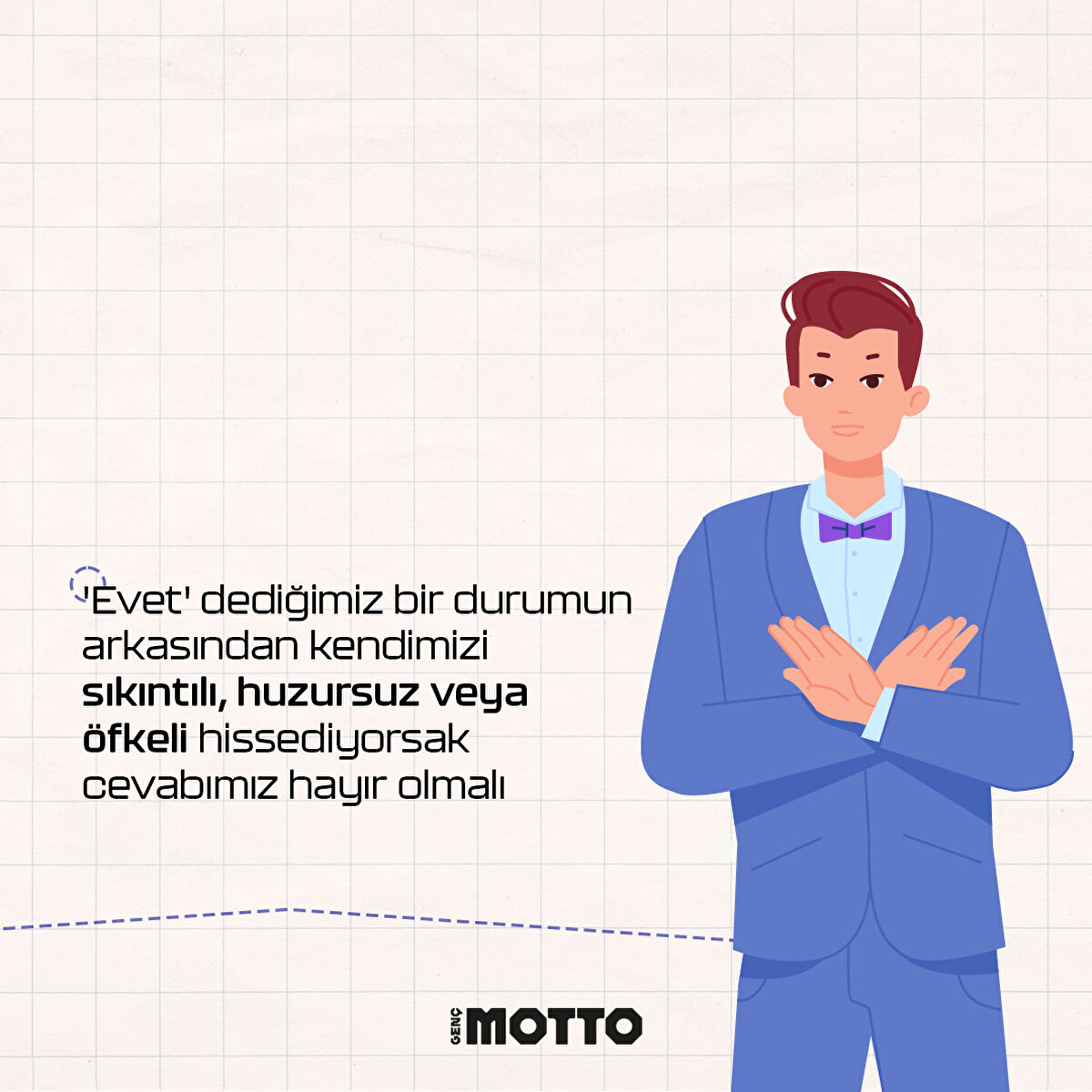 Hayatın her koşulu için tekrar tekrar düşünüp yeni kararlar vermek yerine kendimize prensipler oluşturmamız "hayır" demeyi kolaylaştırır. Peki neden "hayır" diyemiyorsun? Hayır demek için ne yapmalısın?