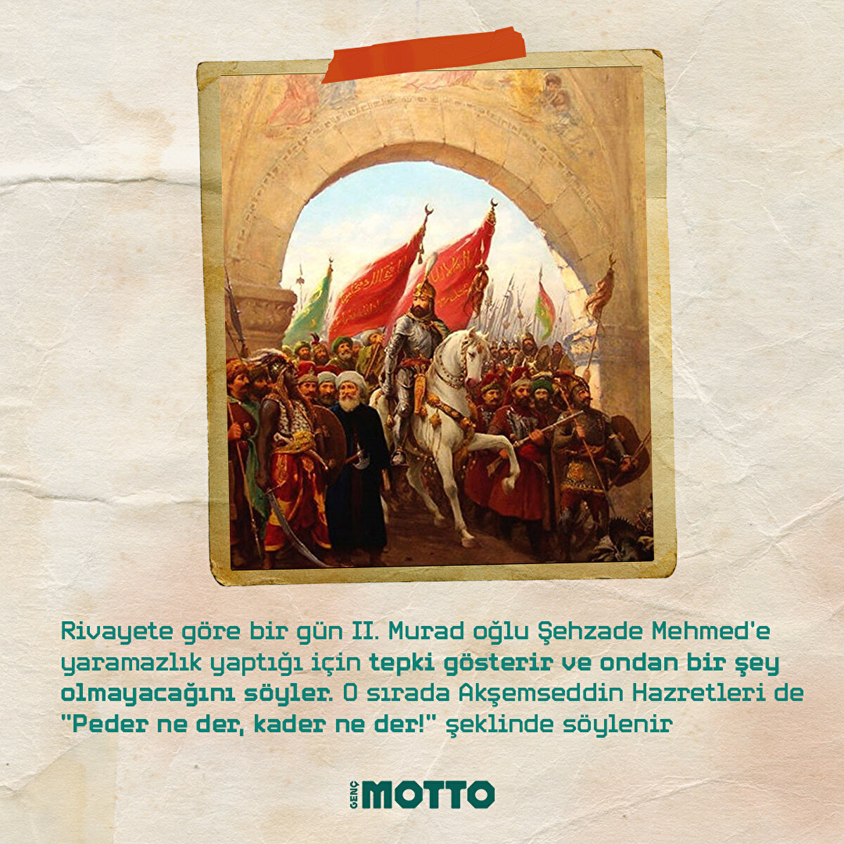 Rivayete göre bir gün II. Murad oğlu Şehzade Mehmed'e yaramazlık yaptığı için tepki gösterir ve ondan bir şey olmayacağını söyler. O sırada Akşemseddin Hazretleri de ''Peder ne der, kader ne der!'' şeklinde söylenir
