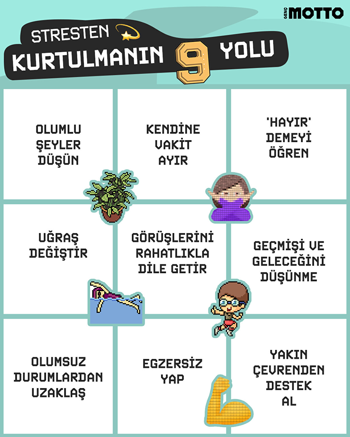 Kimi zaman yaptığımız bir hata yüzünden kimi zamanda farklı bir sebepten kendimizi çoğu kez strese sokarız. Bu durum ilerledikçe hem bedensel hem de ruhsal anlamda ciddi sağlık problemlerine yol açar. Genç Motto, uygulayıp hayatınızın merkezine almanız için 'Stresten kurtulmanın 9 yolu'nu sizin için hazırladı.
