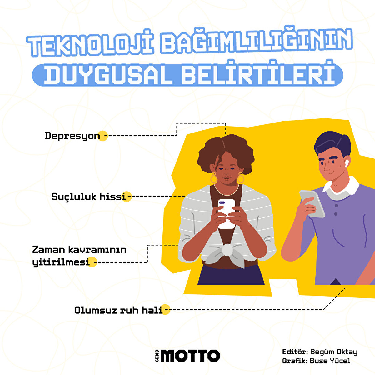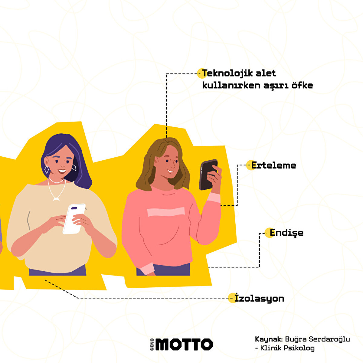 Günümüzde akıllı cihazların ve yeni medyanın bilinçsiz kullanılmasıyla birlikte teknoloji bağımlılığı çok sayıda kişiyi etkisi altına almaya başladı. Klinik Psikolog Buğra Serdaroğlu, teknoloji bağımlılığının duygusal belirtilerini Genç Motto'ya anlattı.
