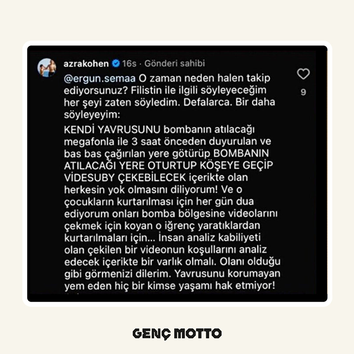 Kohen Filistinli aileleri çocuklarını korumamak ve kasten bombalanacağı belli olan yerlere çocuklarını bırakarak ölümlerine sebep olduktan sonra video çekip propaganda yapmakla suçladı📌Kohen yaptığı yorumda "Filistin'e neden kimsenin yardım etmediğini anlıyorum çocuklarını kendine kalkan yapan bir ulus yok olmaya mahkumdur. Soylarında problem var. Dünyanın hiçbir yerinde 'sadece çocuklar ölmüyor' çünkü onları aileleri koruyor Filistinliler dışında." ifadesini kullandı📌Bir başka yorumunda ise "Kendi soyunu demagoji için kullanan bomba atılacağı anons edildiği halde çocuklarını götürüp ellerinde kamera ile bekleyen bu kişilerin yok olmasını diliyorum. Kendi çıplak ellerimle yok olmasına yardım edecek kadar. Gerçeklikle alakası olmayan sahte kışkırtma ile doldurulmuş bu saçmalıkları kabul etmem mümkün değil. Oradaki çocuklara üzülüyorum ve kurtarılmaları gerektiğine de eminim ama her şeyden önce kendi ailelerinin ellerinden alınmalılar. Dünyada hiçbir ulus çocuklarını böyle kullanmıyor. Böylesine videoların nasıl çekildiğini düşünmemek, analiz etmemek için ciddi zeka geriliği olması lazım" ifadesini kullandı
