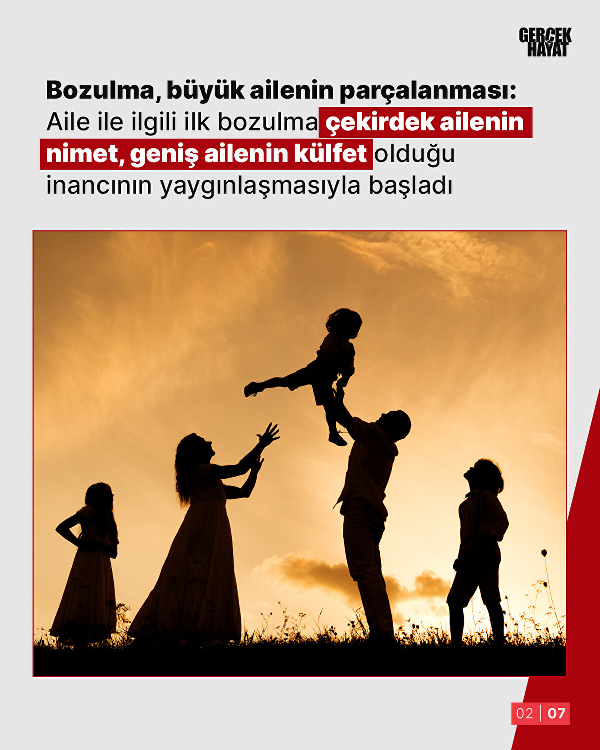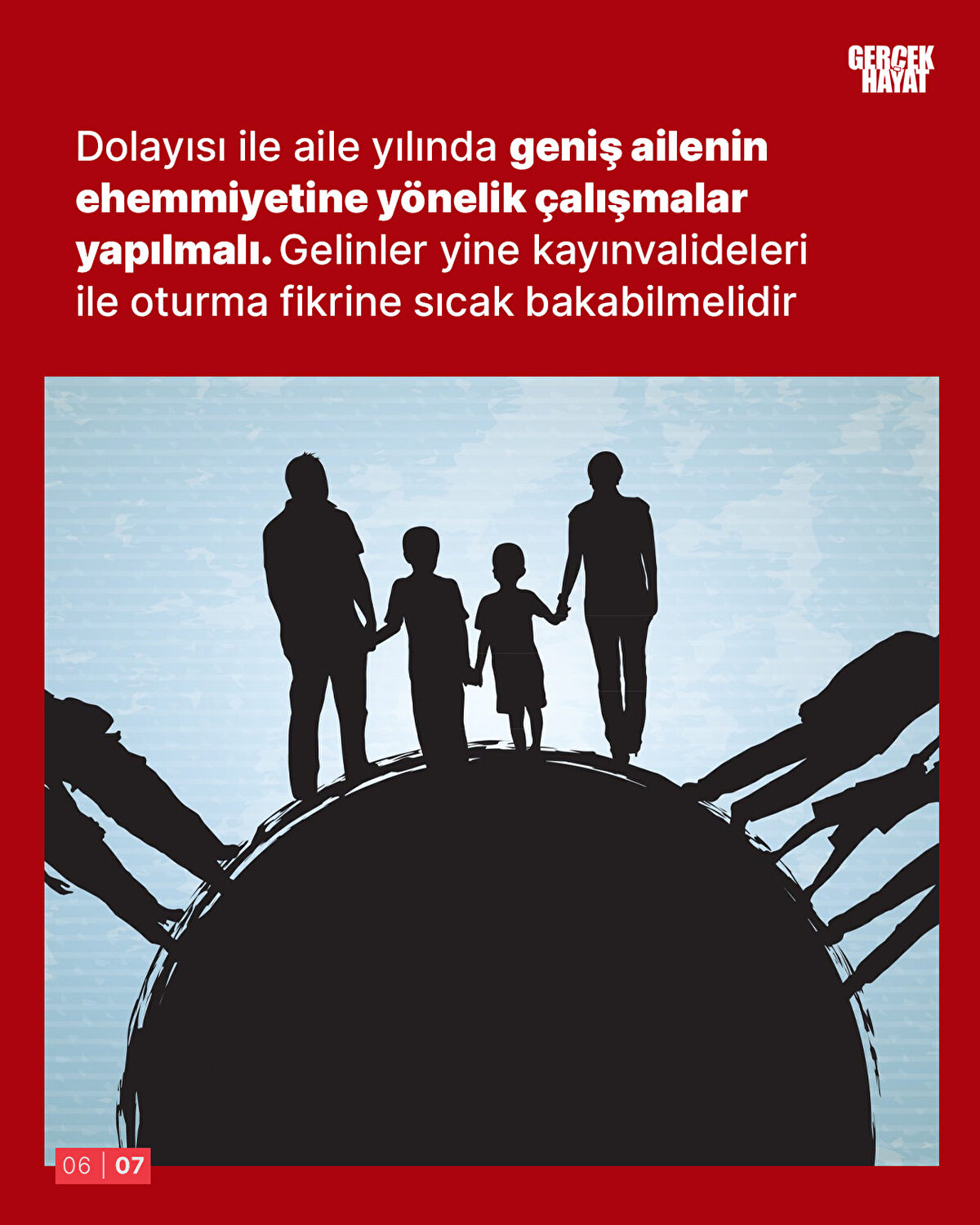 Bozulma, büyük ailenin parçalanması: Aile ile ilgili ilk bozulma çekirdek ailenin nimet, geniş ailenin külfet olduğu inancının yaygınlaşmasıyla başladı. Geniş ailede çocukların sevilmediği safsatası ile başladı belki de her şey. Büyük baba, büyük annenin yanında çocuklarımızı sevemezdik cümlesi çocukların sevgisiz büyüdüğü izlenimini ortaya çıkardı. Fakat çocuğun anne ve babasının azarından kaçarak sığındığı sevgi limanı idi dede, nine. Dolayısı ile aile yılında geniş ailenin ehemmiyetine yönelik çalışmalar yapılmalı. Gelinler yine kayınvalideleri ile oturma fikrine sıcak bakabilmelidir.
