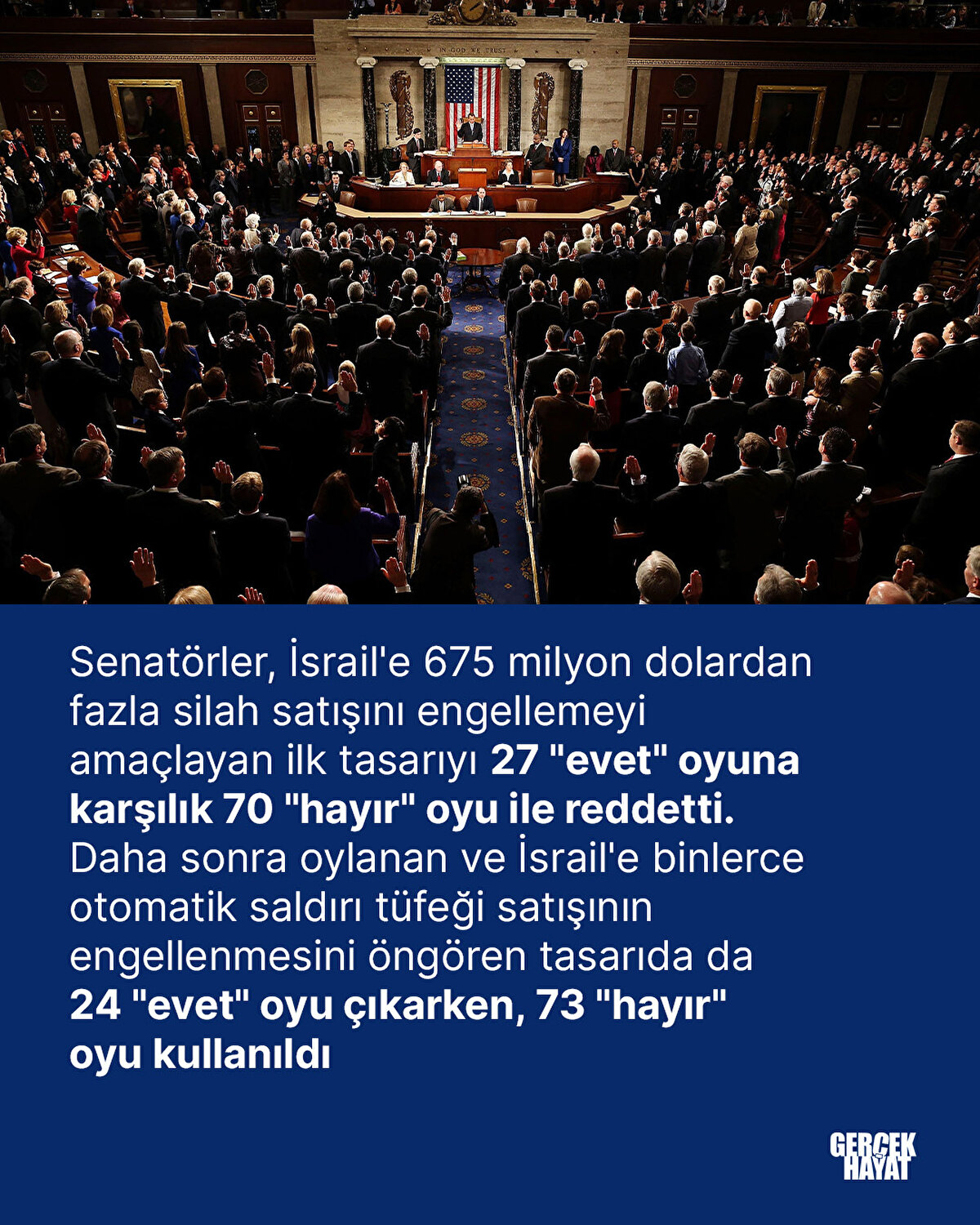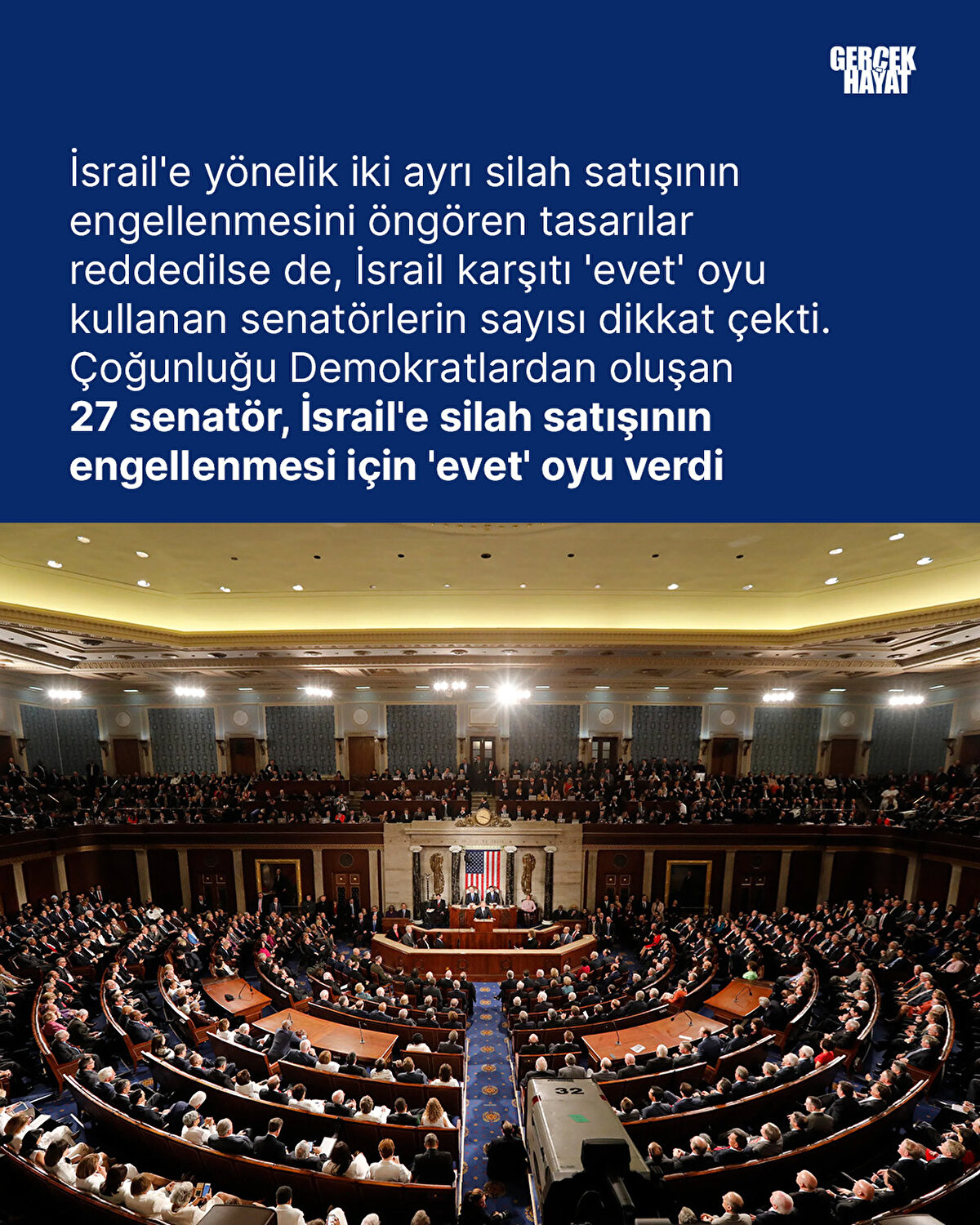 Senatörler, İsrail'e 675 milyon dolardan fazla silah satışını engellemeyi amaçlayan ilk tasarıyı 27 "evet" oyuna karşılık 70 "hayır" oyu ile reddetti.