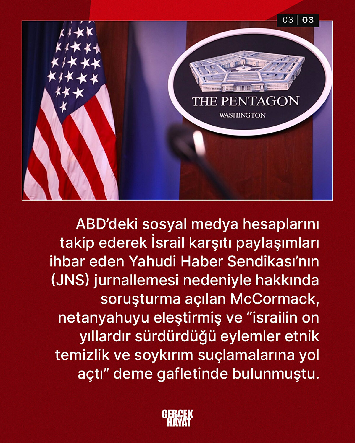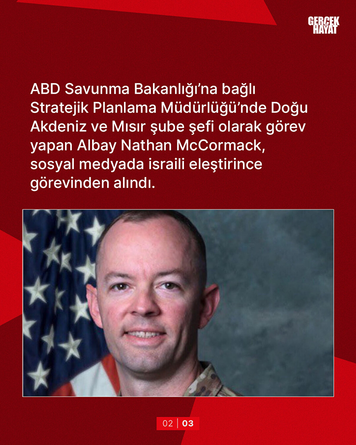 ABD Savunma Bakanlığı'na bağlı Stratejik Planlama Müdürlüğü'nde Doğu Akdeniz ve Mısır şube şefi olarak görev yapan Albay Nathan McCormack, sosyal medyada israili eleştirince görevinden alındı. ABD'deki sosyal medya hesaplarını takip ederek İsrail karşıtı paylaşımları ihbar eden Yahudi Haber Sendikası'nın (JNS) jurnallemesi nedeniyle hakkında soruşturma açılan McCormack, netanyahuyu eleştirmiş ve “israilin on yıllardır sürdürdüğü eylemler etnik temizlik ve soykırım suçlamalarına yol açtı” deme gafletinde bulunmuştu.