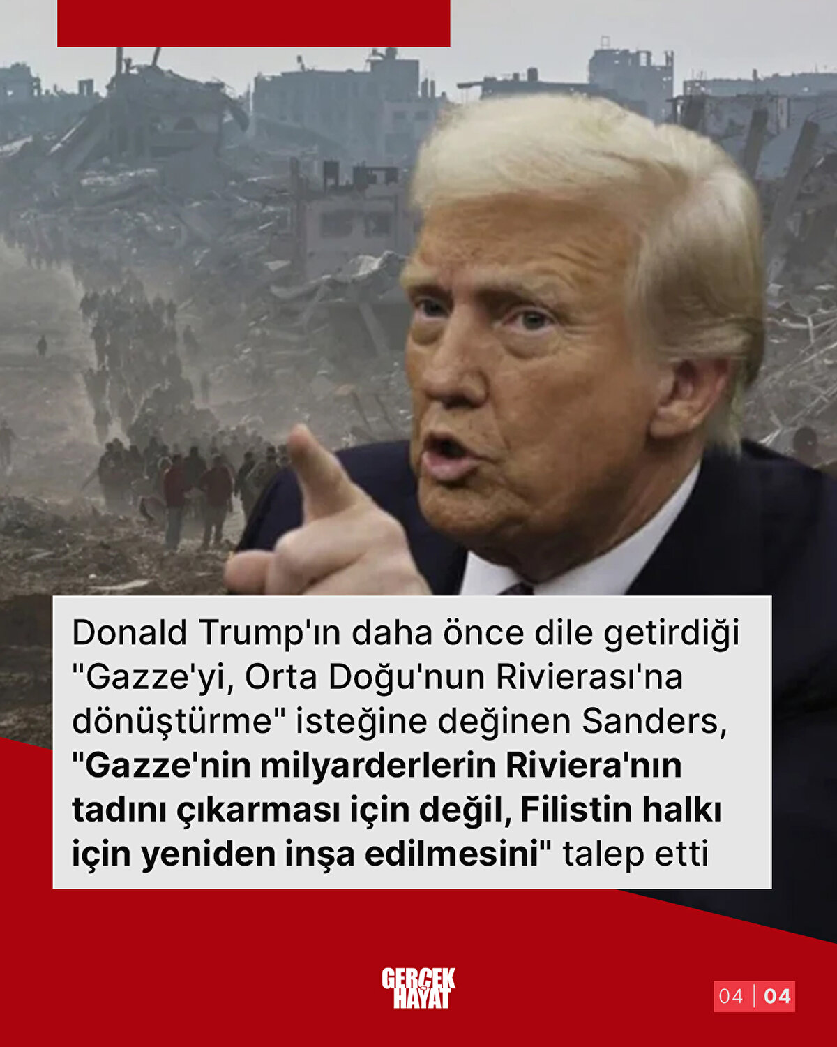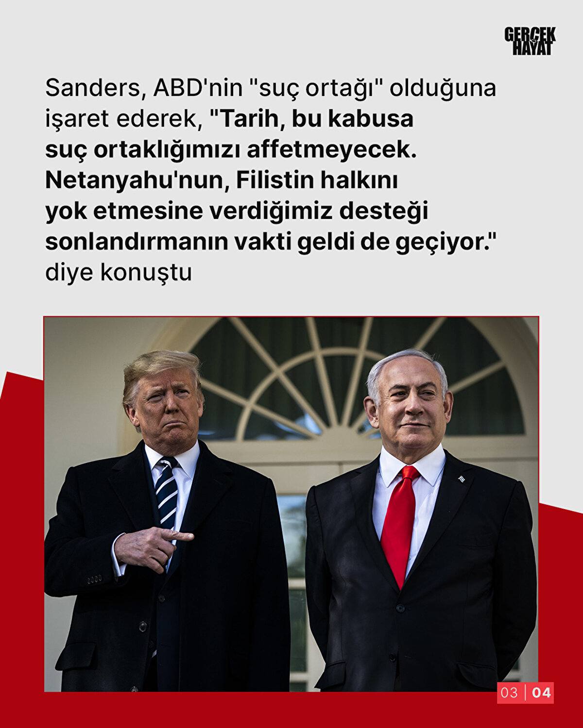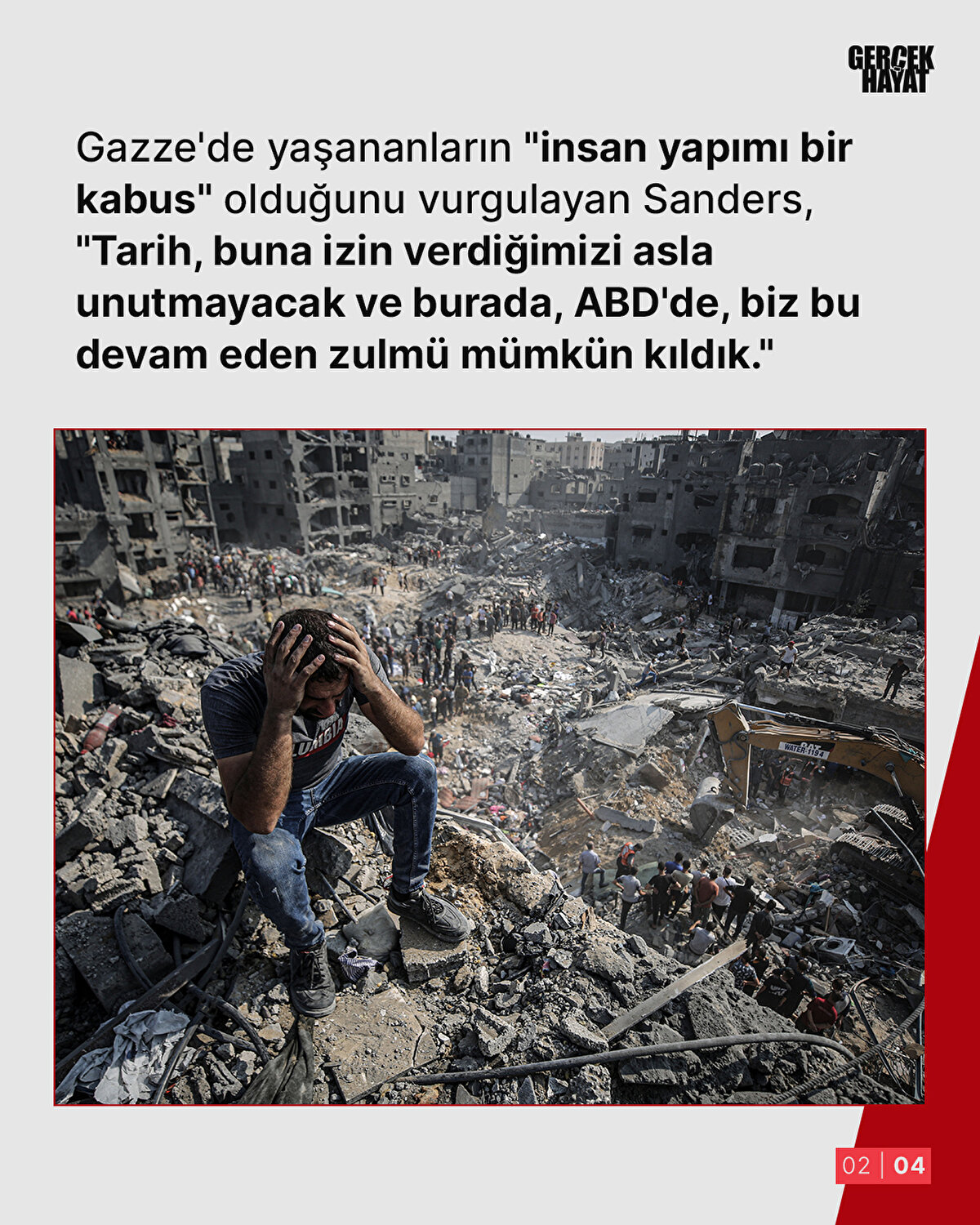 ABD'li Senatör Bernie Sanders, ABD'nin Gazze'de insani felakete yol açma ve bunu sürdürmede "suç ortağı" olduğuna işaret ederek, "Tarih, bu kabusa suç ortaklığımızı affetmeyecek. Netanyahu'nun, Filistin halkını yok etmesine verdiğimiz desteği sonlandırmanın vakti geldi de geçiyor." dedi.