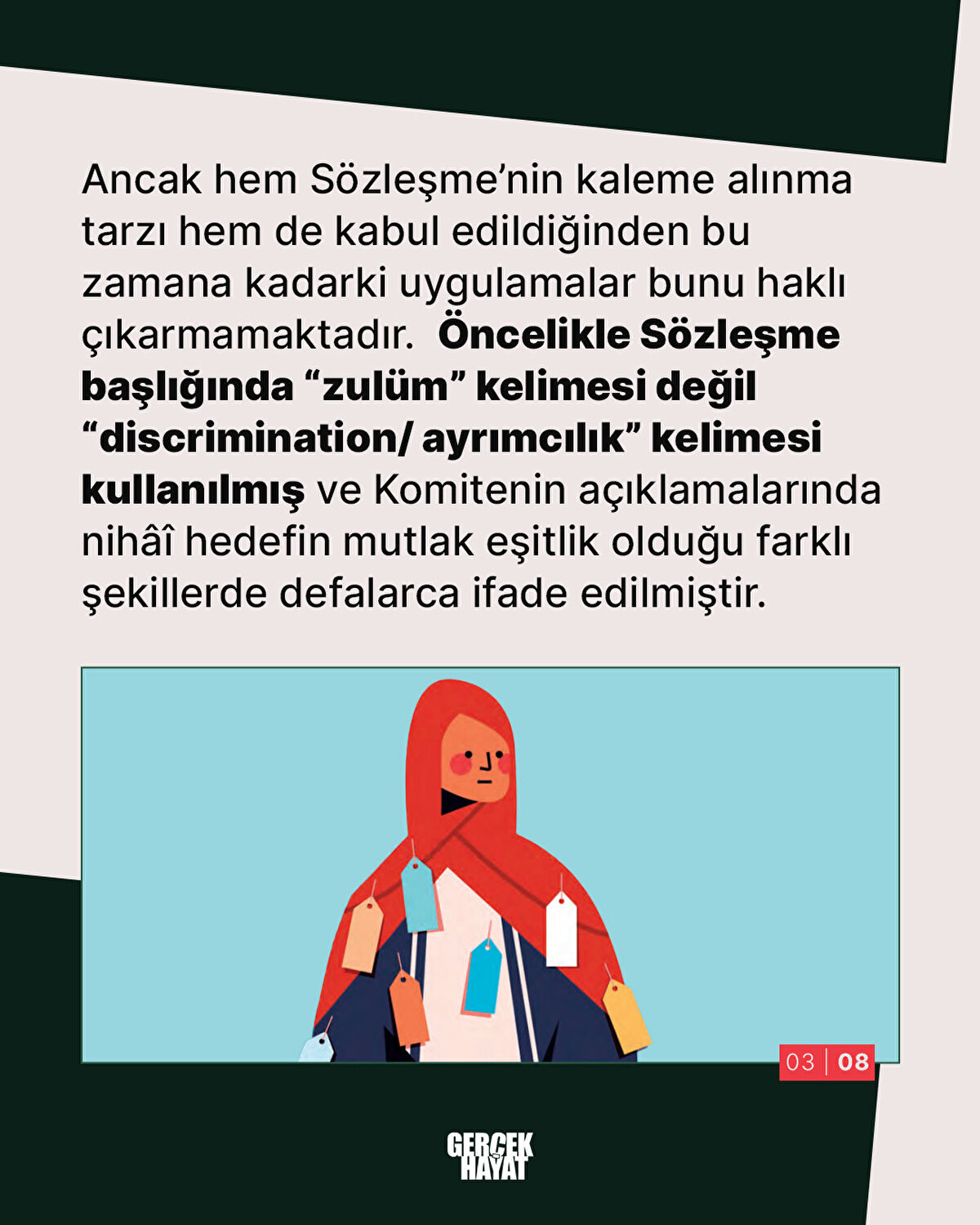 Ancak hem Sözleşme'nin kaleme alınma tarzı hem de kabul edildiğinden bu zamana kadarki uygulamalar bunu haklı çıkarmamaktadır. Öncelikle Sözleşme başlığında “zulüm” kelimesi değil “discrimination/ ayrımcılık” kelimesi kullanılmış ve Komitenin açıklamalarında nihâî hedefin mutlak eşitlik olduğu farklı şekillerde defalarca ifade edilmiştir.