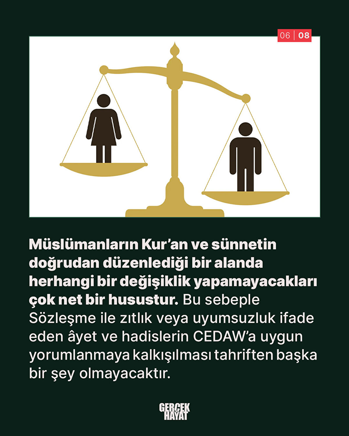 Müslümanların Kur'an ve sünnetin doğrudan düzenlediği bir alanda herhangi bir değişiklik yapamayacakları çok net bir husustur. Bu sebeple Sözleşme ile zıtlık veya uyumsuzluk ifade eden âyet ve hadislerin CEDAW'a uygun yorumlanmaya kalkışılması tahriften başka bir şey olmayacaktır.