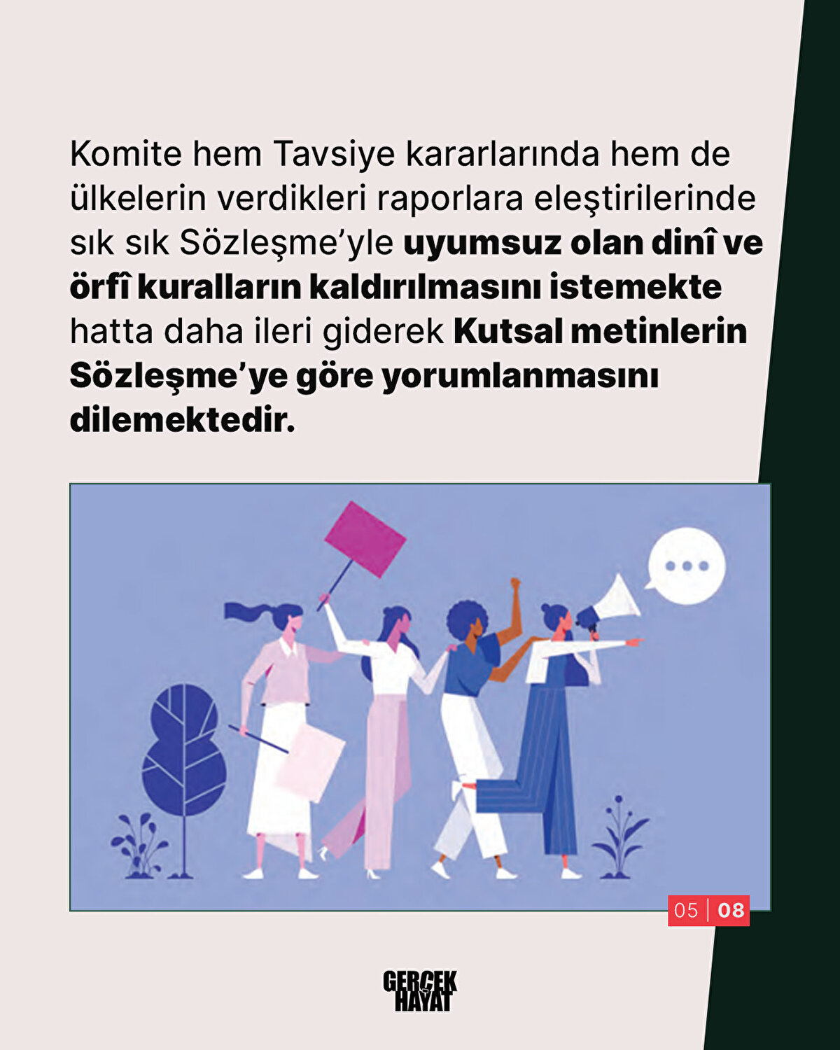 Komite hem Tavsiye kararlarında hem de ülkelerin verdikleri raporlara eleştirilerinde sık sık Sözleşme'yle uyumsuz olan dinî ve örfî kuralların kaldırılmasını istemekte hatta daha ileri giderek Kutsal metinlerin Sözleşme'ye göre yorumlanmasını dilemektedir.