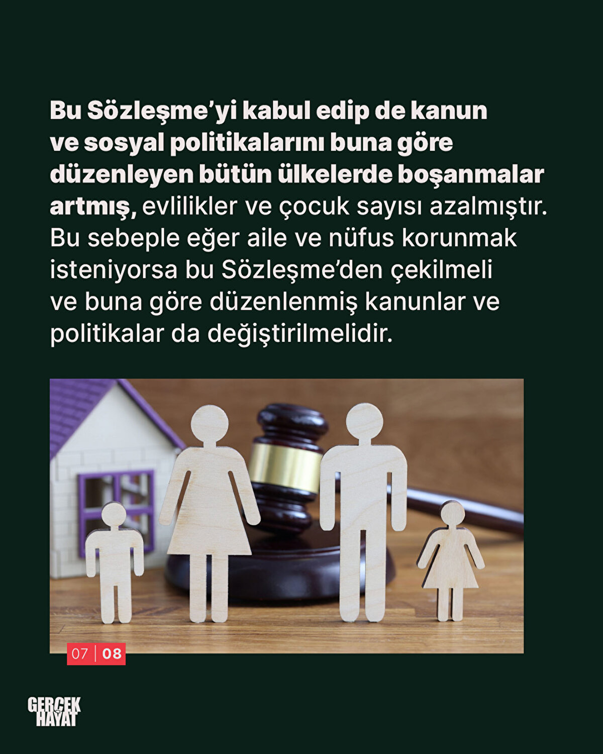 Bu Sözleşme'yi kabul edip de kanun ve sosyal politikalarını buna göre düzenleyen bütün ülkelerde boşanmalar artmış, evlilikler ve çocuk sayısı azalmıştır. Bu sebeple eğer aile ve nüfus korunmak isteniyorsa bu Sözleşme'den çekilmeli ve buna göre düzenlenmiş kanunlar ve politikalar da değiştirilmelidir.