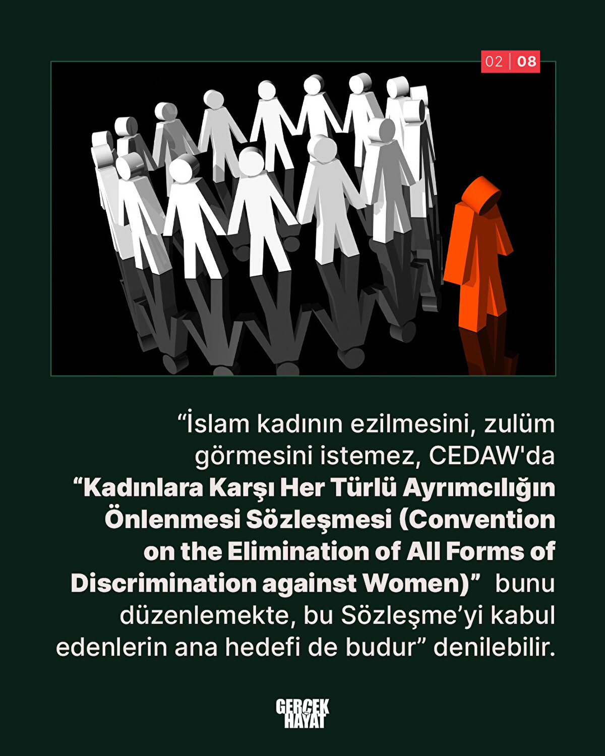 “İslam kadının ezilmesini, zulüm görmesini istemez, CEDAW'da “Kadınlara Karşı Her Türlü Ayrımcılığın Önlenmesi Sözleşmesi (Convention on the Elimination of All Forms of Discrimination against Women)” bunu düzenlemekte, bu Sözleşme'yi kabul edenlerin ana hedefi de budur” denilebilir.