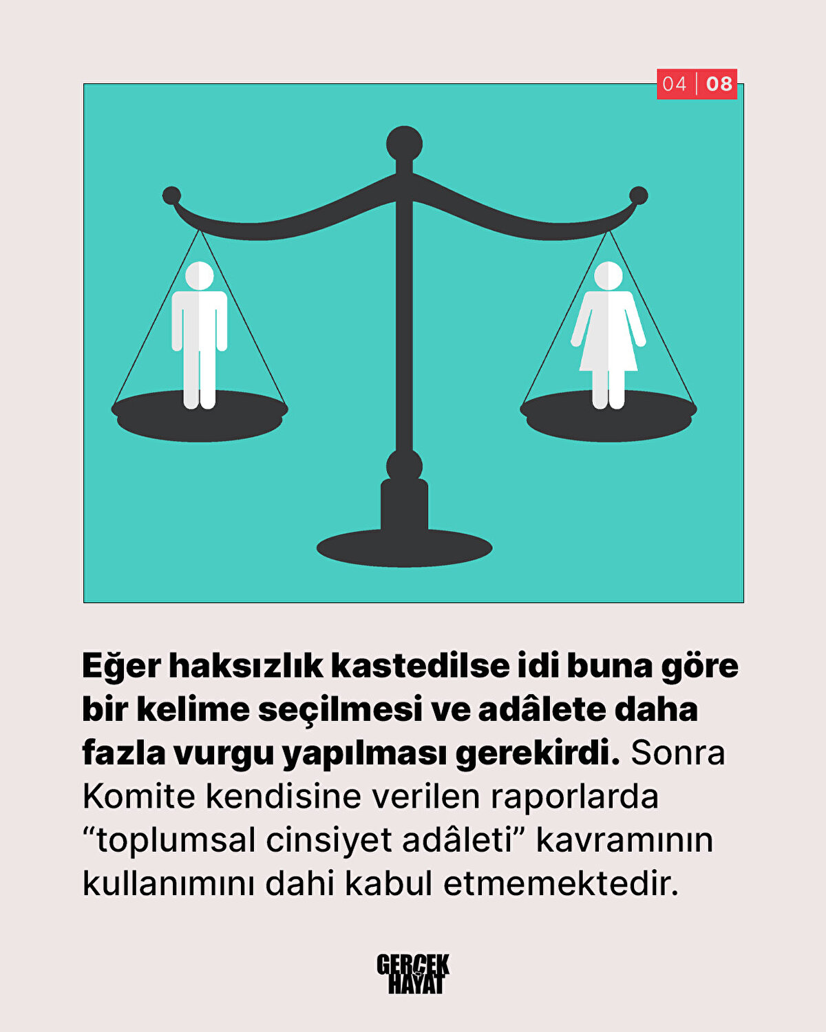 Eğer haksızlık kastedilse idi buna göre bir kelime seçilmesi ve adâlete daha fazla vurgu yapılması gerekirdi. Sonra Komite kendisine verilen raporlarda “toplumsal cinsiyet adâleti” kavramının kullanımını dahi kabul etmemektedir.