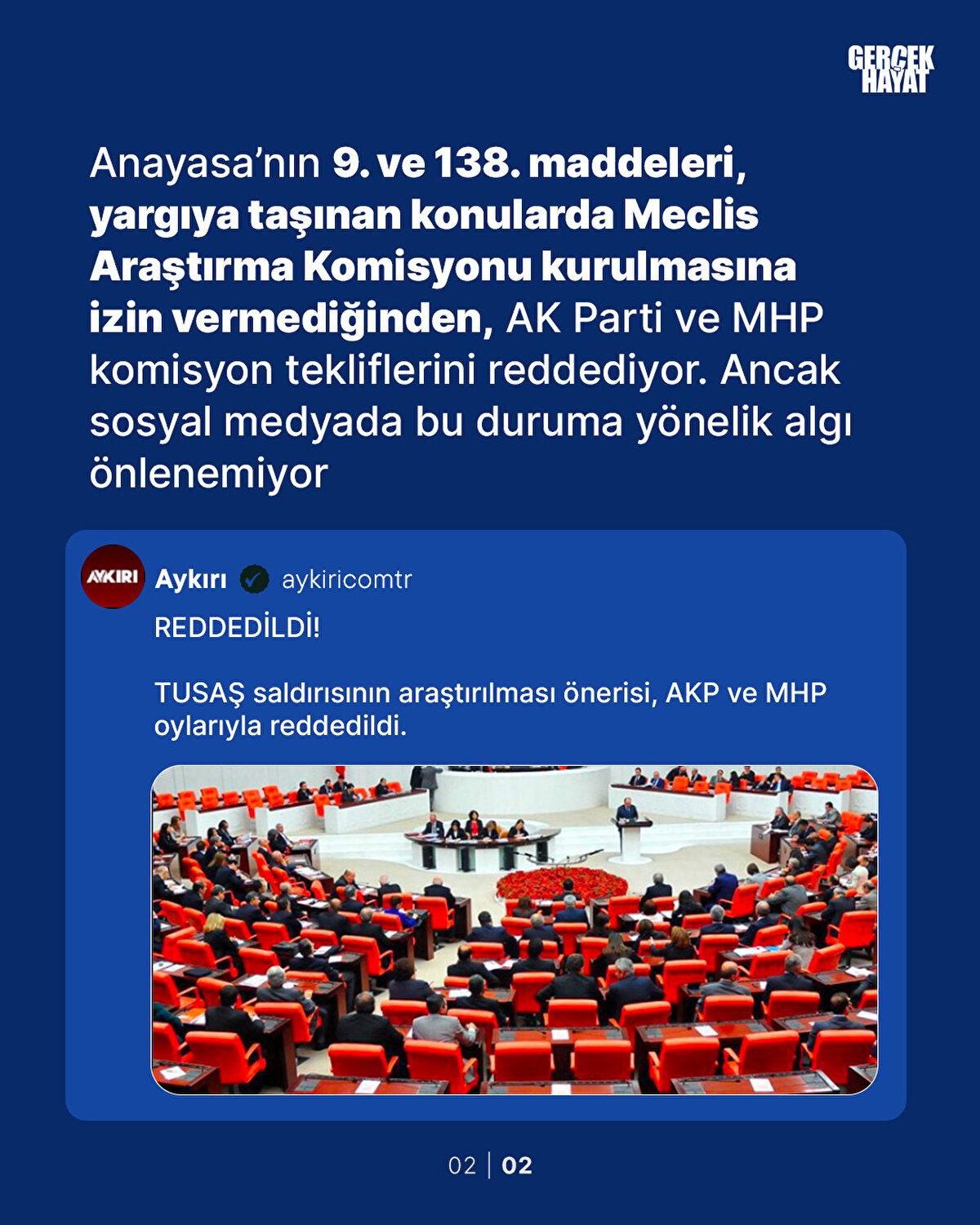 Anayasa'nın 9. ve 138. maddelerine göre yargıdaki konu için meclis komisyon kuramaz. Buna rağmen, her toplumsal olayda CHP meclise komisyon teklifi sunuyor. AK Parti ve MHP reddedince bu algı çalışması sosyal medyaya servis ediliyor