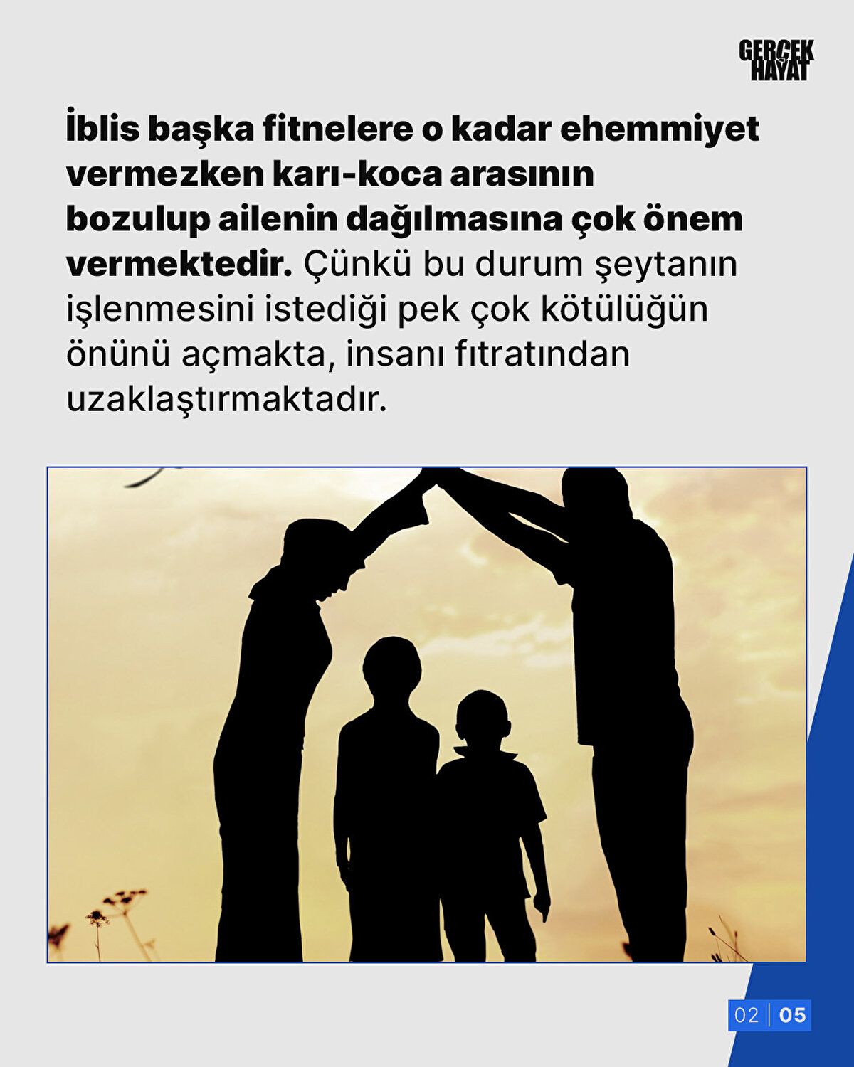 İblis başka fitnelere o kadar ehemmiyet vermezken karı-koca arasının bozulup ailenin dağılmasına çok önem vermektedir. Çünkü bu durum şeytanın işlenmesini istediği pek çok kötülüğün önünü açmakta, insanı fıtratından uzaklaştırmaktadır.