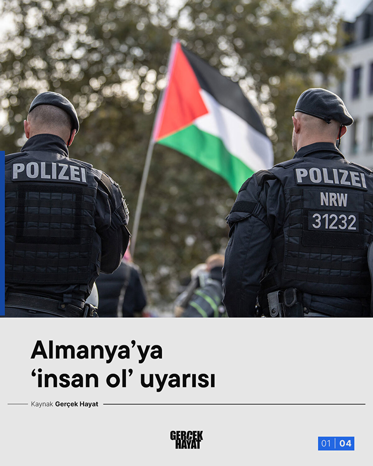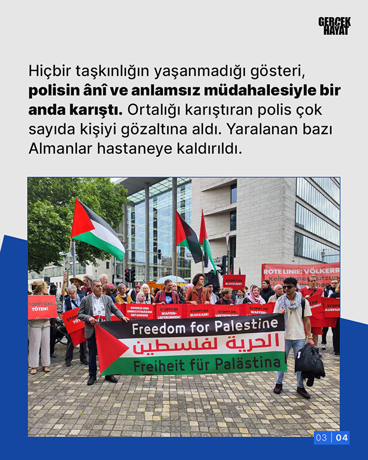 Almanya'da başkent Berlin ve Frankfurt gibi büyük şehirlerde geçtiğimiz ay çok büyük gösteriler vardı. 100 binden fazla Almanyalı, Gazze'deki soykırıma tepki göstermek için sokaklara döküldü. Hiçbir taşkınlığın yaşanmadığı gösteri, polisin ânî ve anlamsız müdahalesiyle bir anda karıştı. Ortalığı karıştıran polis çok sayıda kişiyi gözaltına aldı. Yaralanan bazı Almanlar hastaneye kaldırıldı. Polis terörünün ardından açıklama yapan Avrupa Konseyi İnsan Hakları Komiseri Michael O'Flaherty, Alman hükümetini estirdiği polis terörü nedeniyle eleştirdi ve 'endişelerini' dile getirdi. Bunun üzerine açıklama yapmayan Alman hükümeti 'kardeşim biz zaten Nazi artığıyız. Bizden ne bekliyorsunuz ki' demedi.