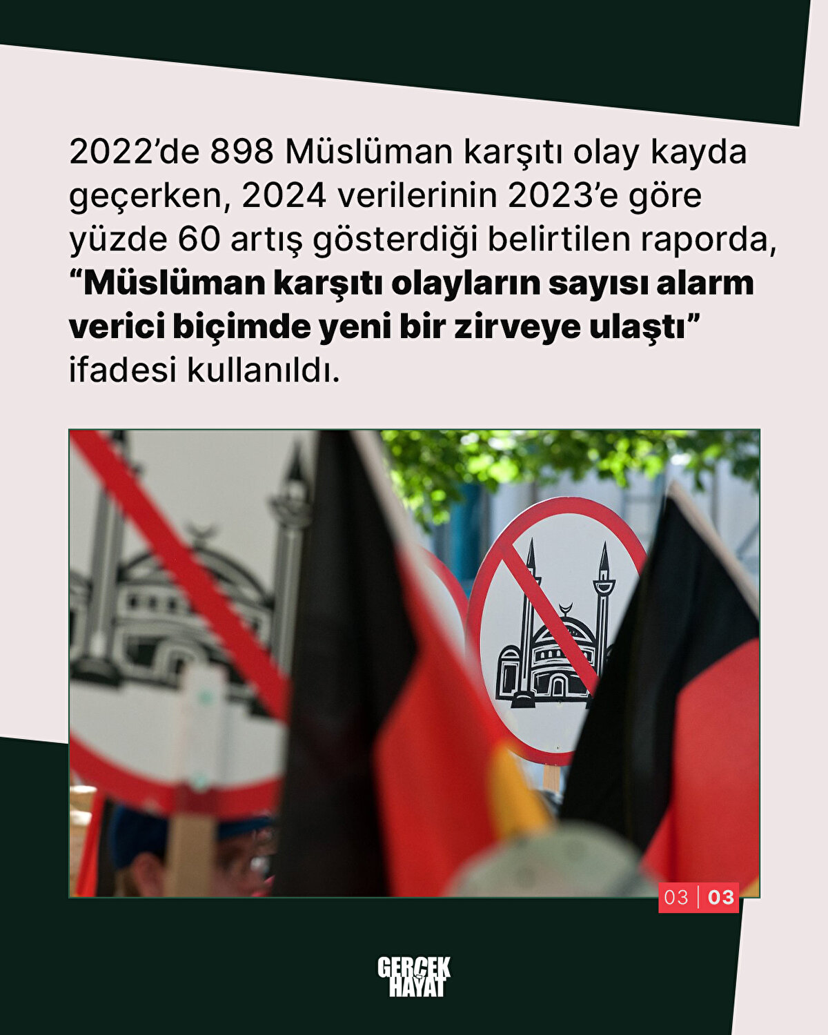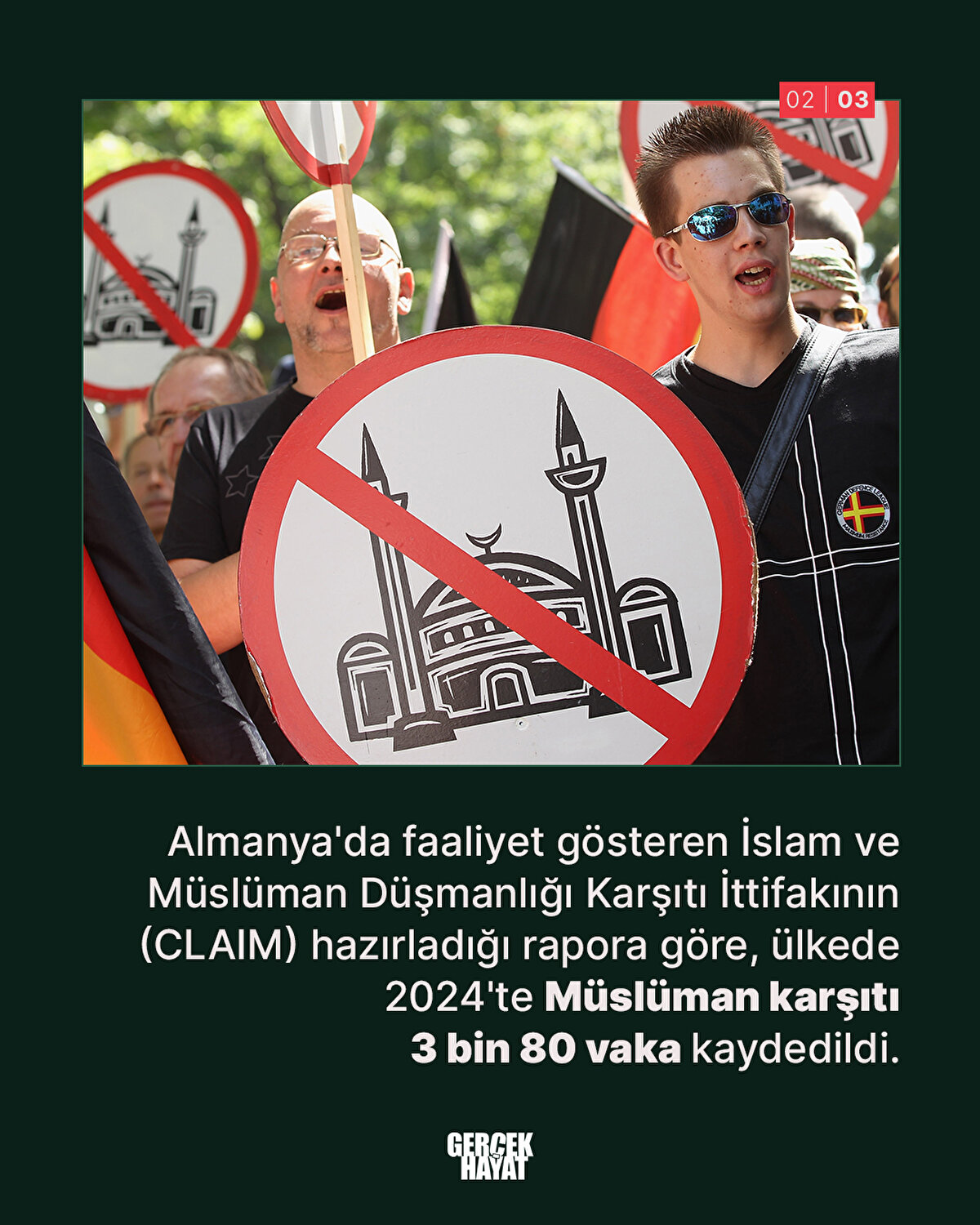 Almanya'da faaliyet gösteren İslam ve Müslüman Düşmanlığı Karşıtı İttifakının (CLAIM) hazırladığı rapora göre, ülkede 2024'te Müslüman karşıtı 3 bin 80 vaka kaydedildi.