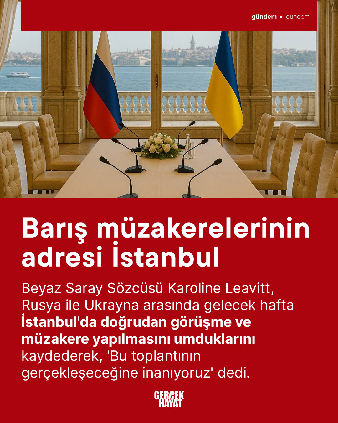 Beyaz Saray Sözcüsü Karoline Leavitt, Rusya ile Ukrayna arasında gelecek hafta İstanbul'da doğrudan görüşme ve müzakere yapılmasını umduklarını kaydederek, 'Bu toplantının gerçekleşeceğine inanıyoruz' dedi.