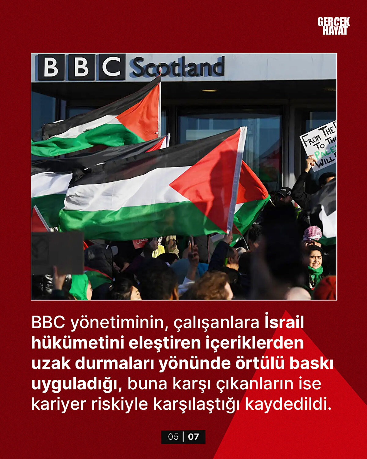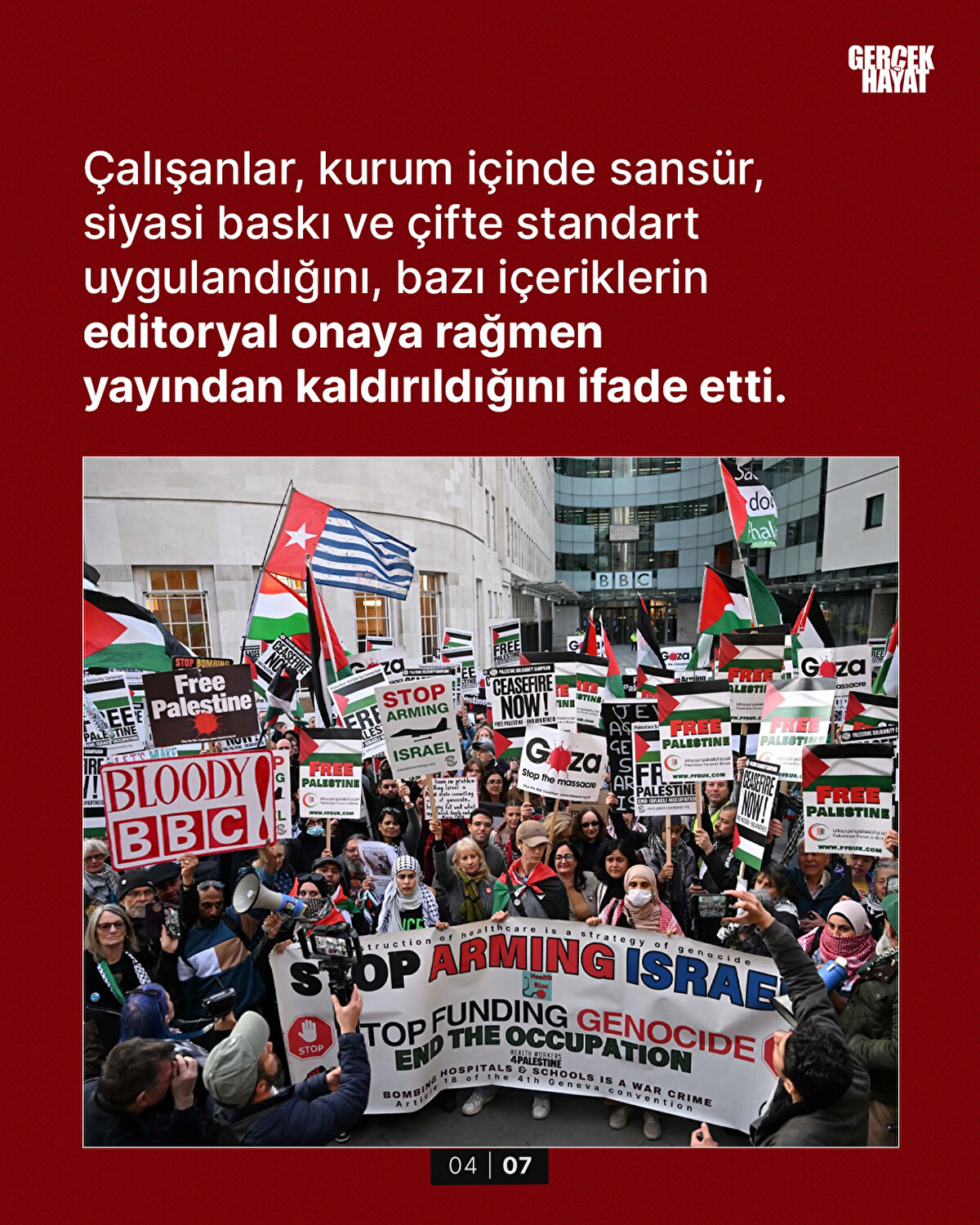 Çalışanlar, kurum içinde sansür, siyasi baskı ve çifte standart uygulandığını, bazı içeriklerin editoryal onaya rağmen yayından kaldırıldığını ifade etti. BBC yönetiminin, çalışanlara İsrail hükümetini eleştiren içeriklerden uzak durmaları yönünde örtülü baskı uyguladığı, buna karşı çıkanların ise kariyer riskiyle karşılaştığı kaydedildi.BBC çalışanları, kurumu "tarafsız habercilikten sapmak" ve "kamuoyunu yönlendirmek amacıyla İsrail yanlısı söylemi dayatmakla" suçlayarak, editoryal bağımsızlığın yeniden tesis edilmesini talep etti.İngiliz köşe yazarı Owen Jones, BBC'nin Filistin'e yönelik sansür iddialarını doğruladı. Jones, paylaşımında, BBC'nin yüzlerce çalışanının İsrail'in sözcülüğünü yapmak zorunda bırakıldığını kaydetti.