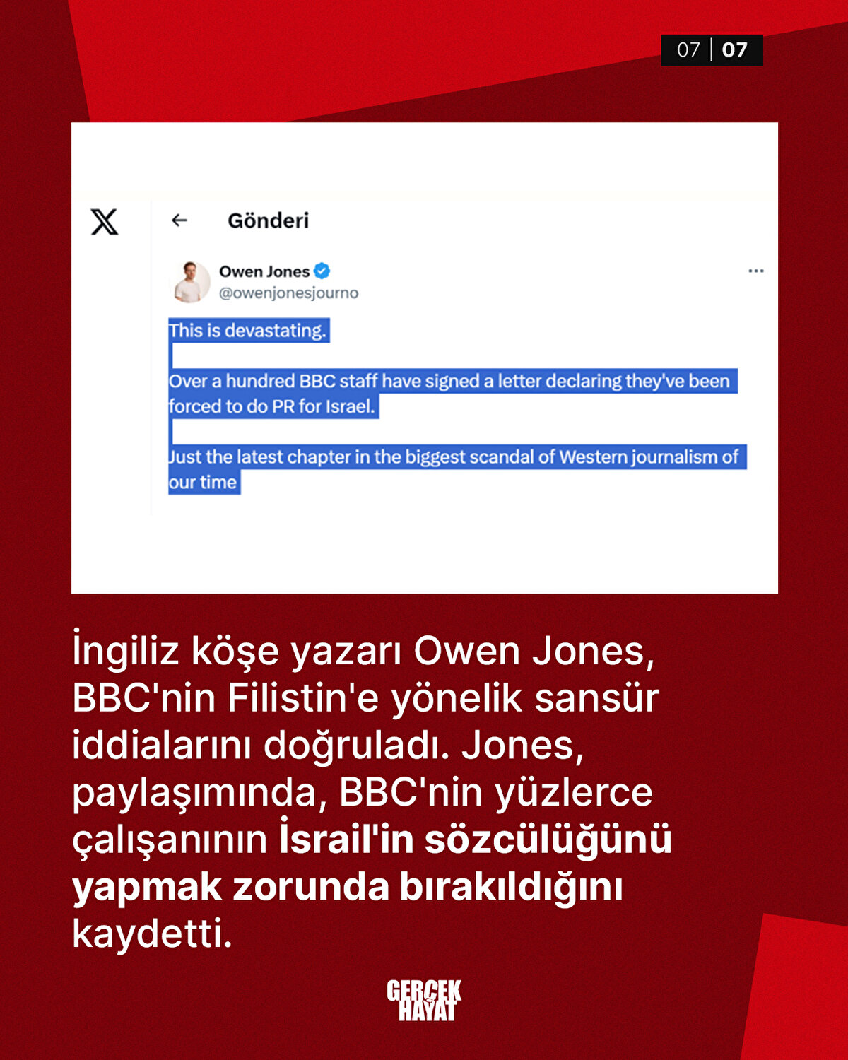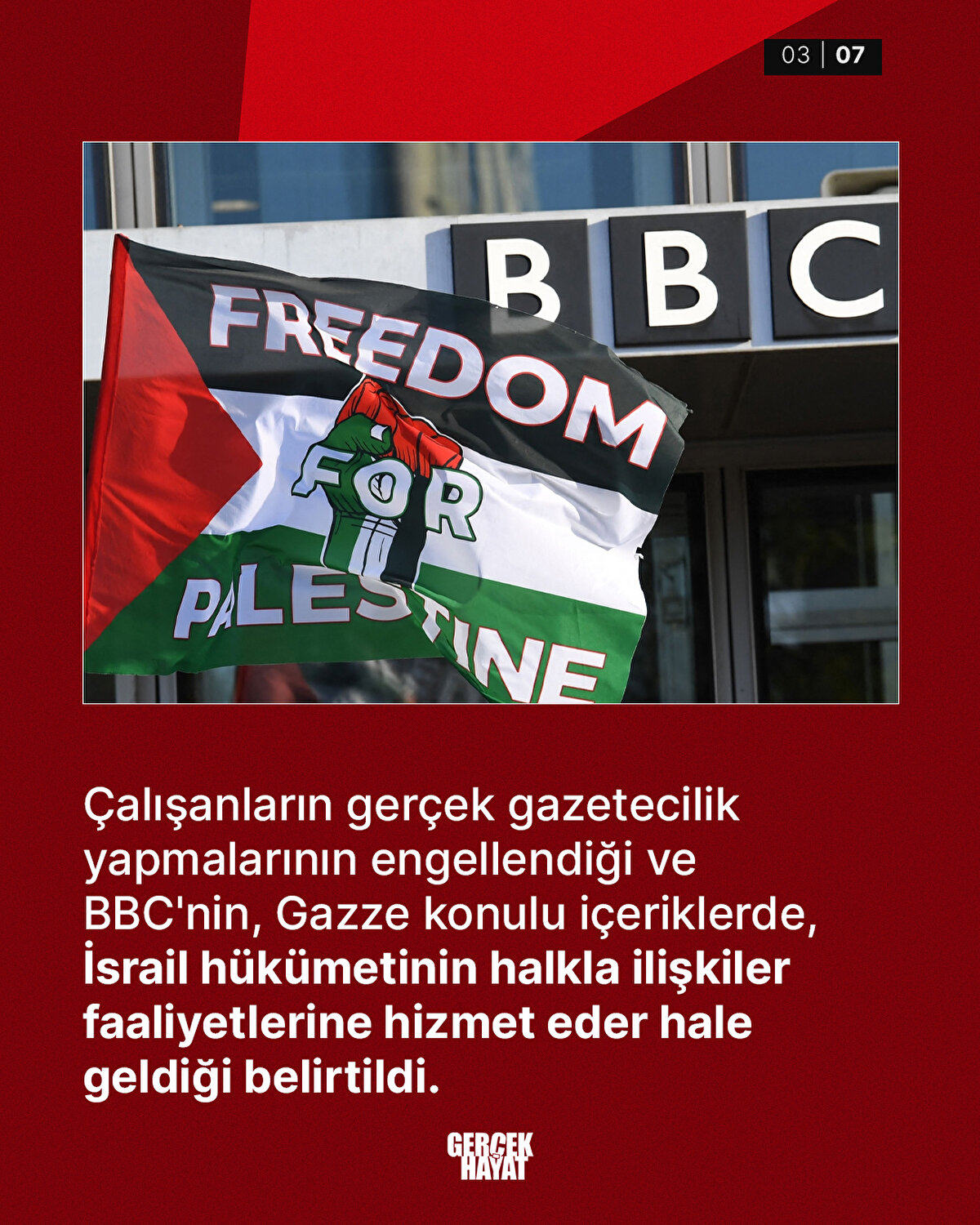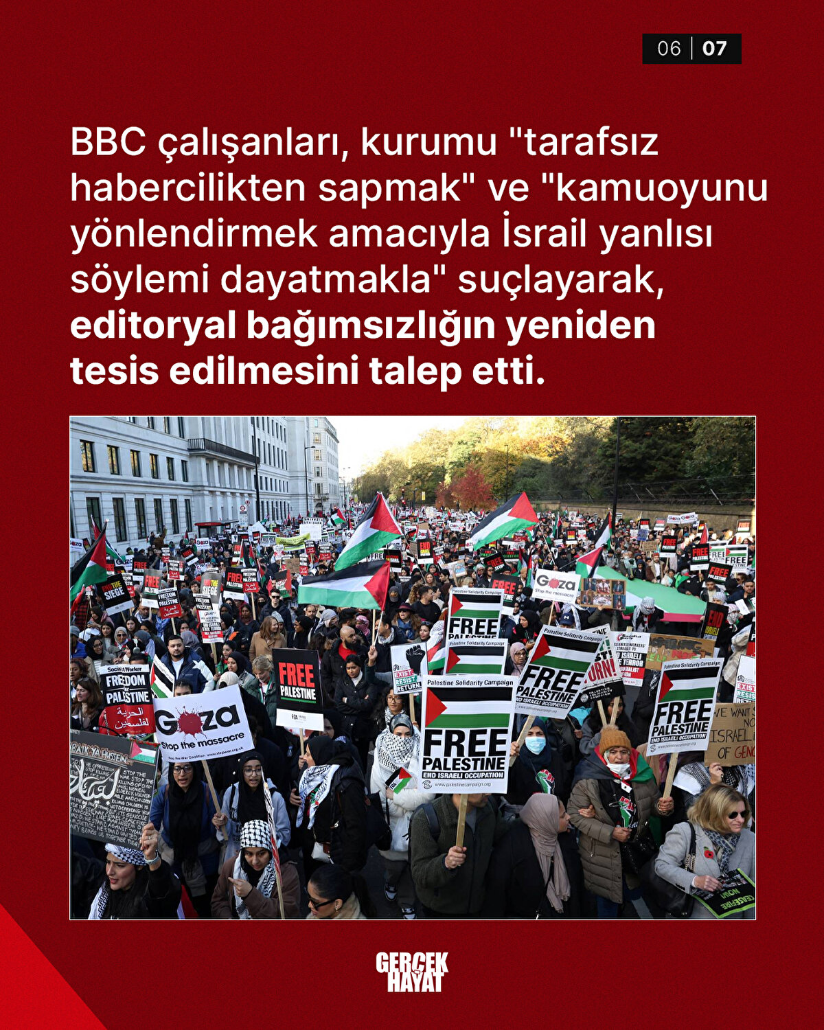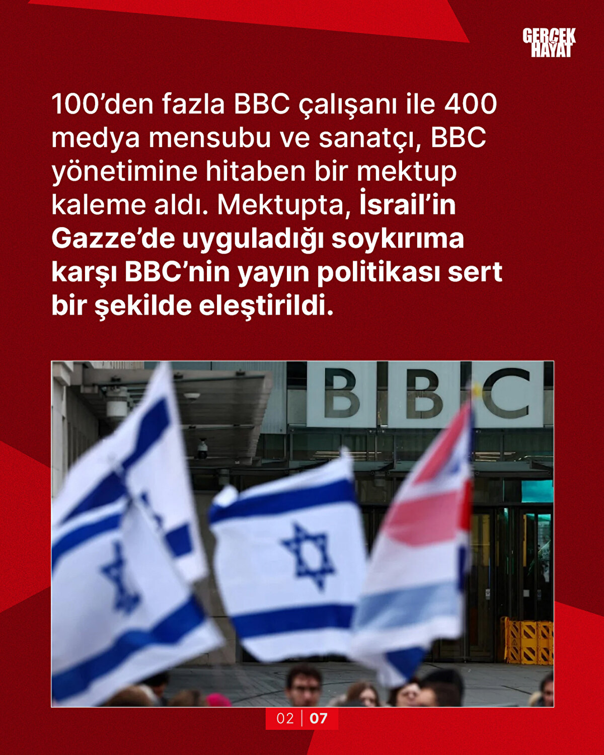 100'den fazla BBC çalışanı ile 400 medya mensubu ve sanatçı, BBC yönetimine hitaben bir mektup kaleme aldı. Mektupta, İsrail'in Gazze'de uyguladığı soykırıma karşı BBC'nin yayın politikası sert bir şekilde eleştirildi.Çalışanların gerçek gazetecilik yapmalarının engellendiği ve BBC'nin, Gazze konulu içeriklerde, İsrail hükümetinin halkla ilişkiler faaliyetlerine hizmet eder hale geldiği belirtildi.